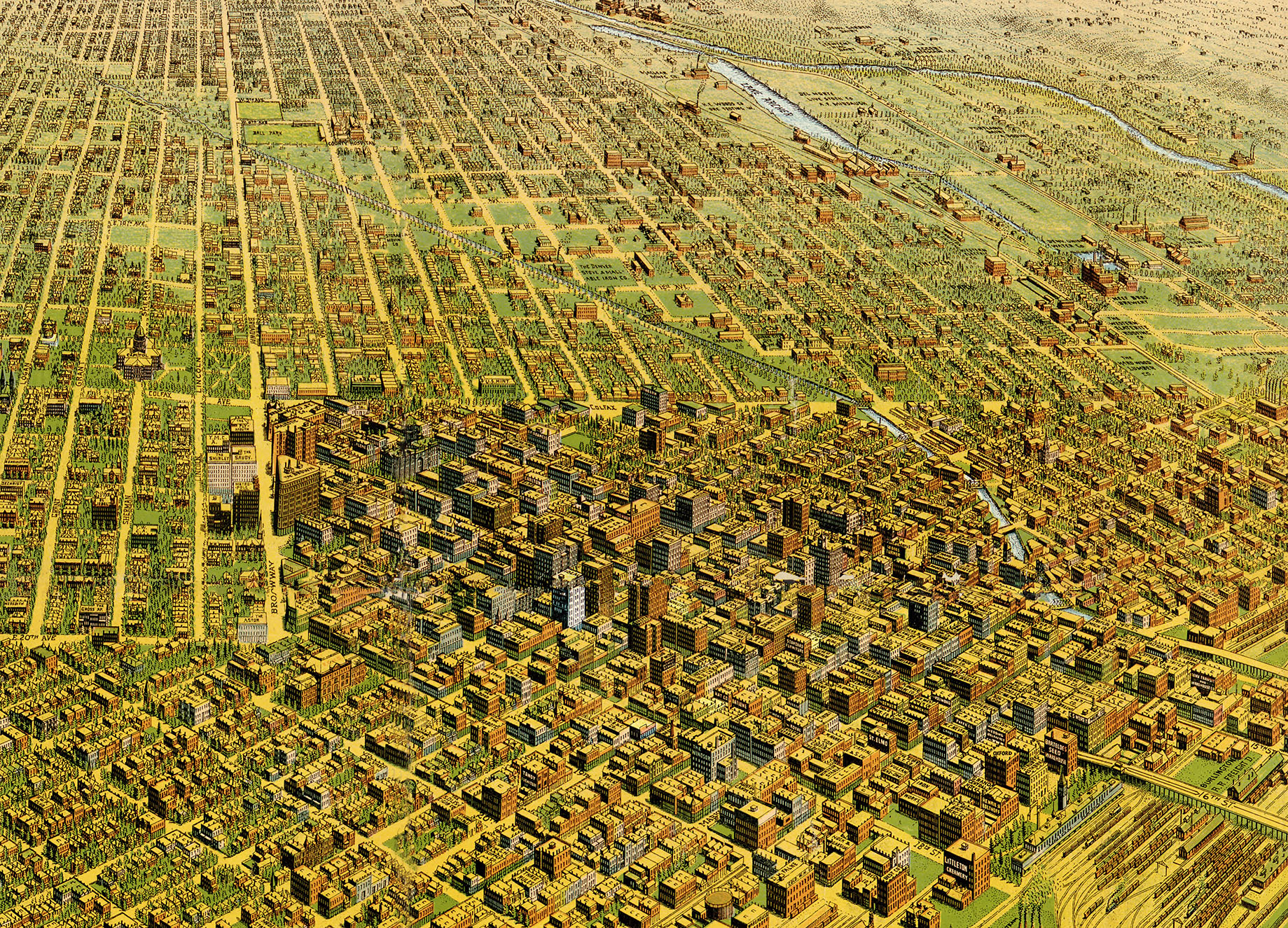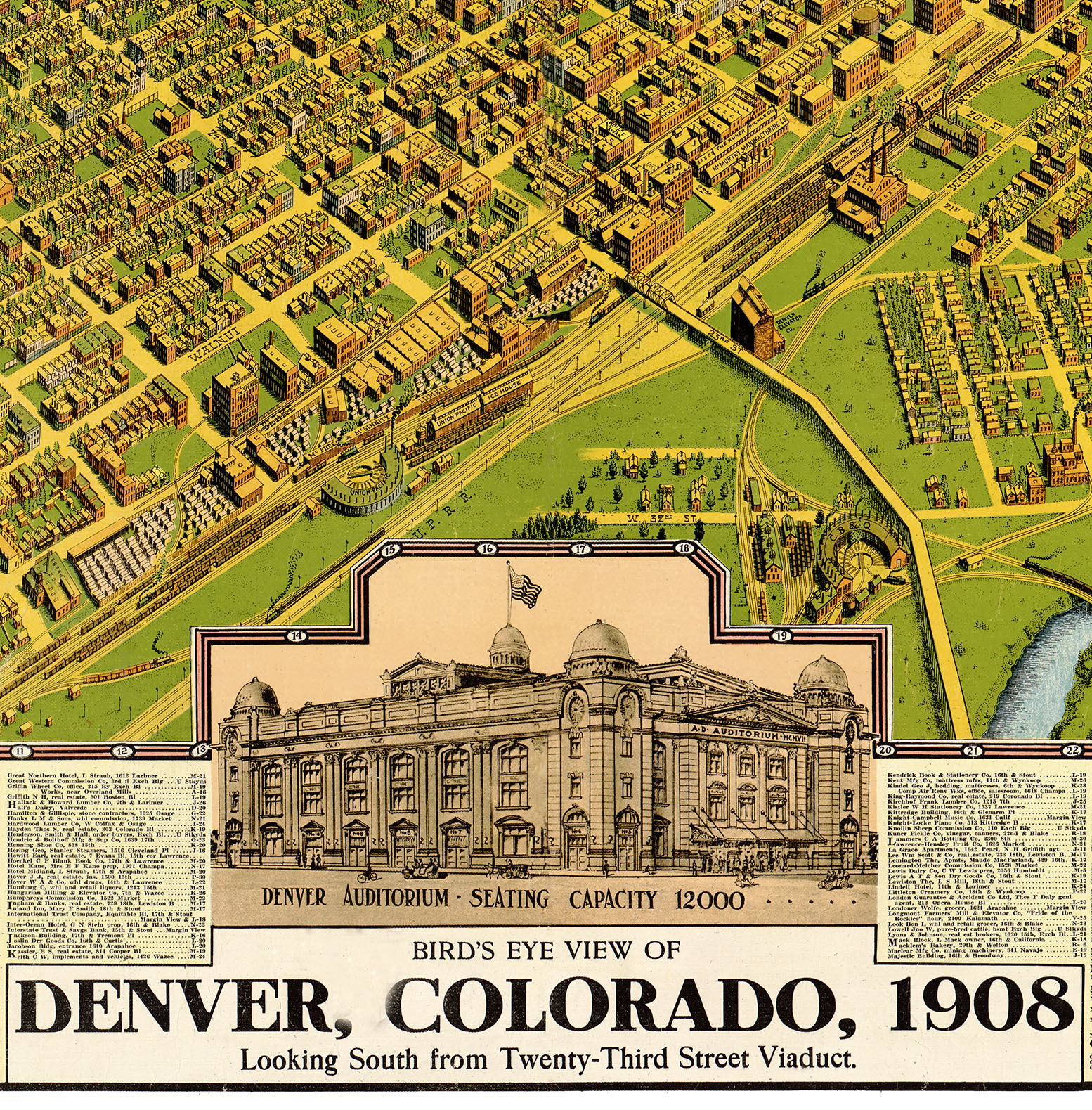 Full color fine art map of Denver, CO in 1908. Brilliant colors, extremely fine detail.