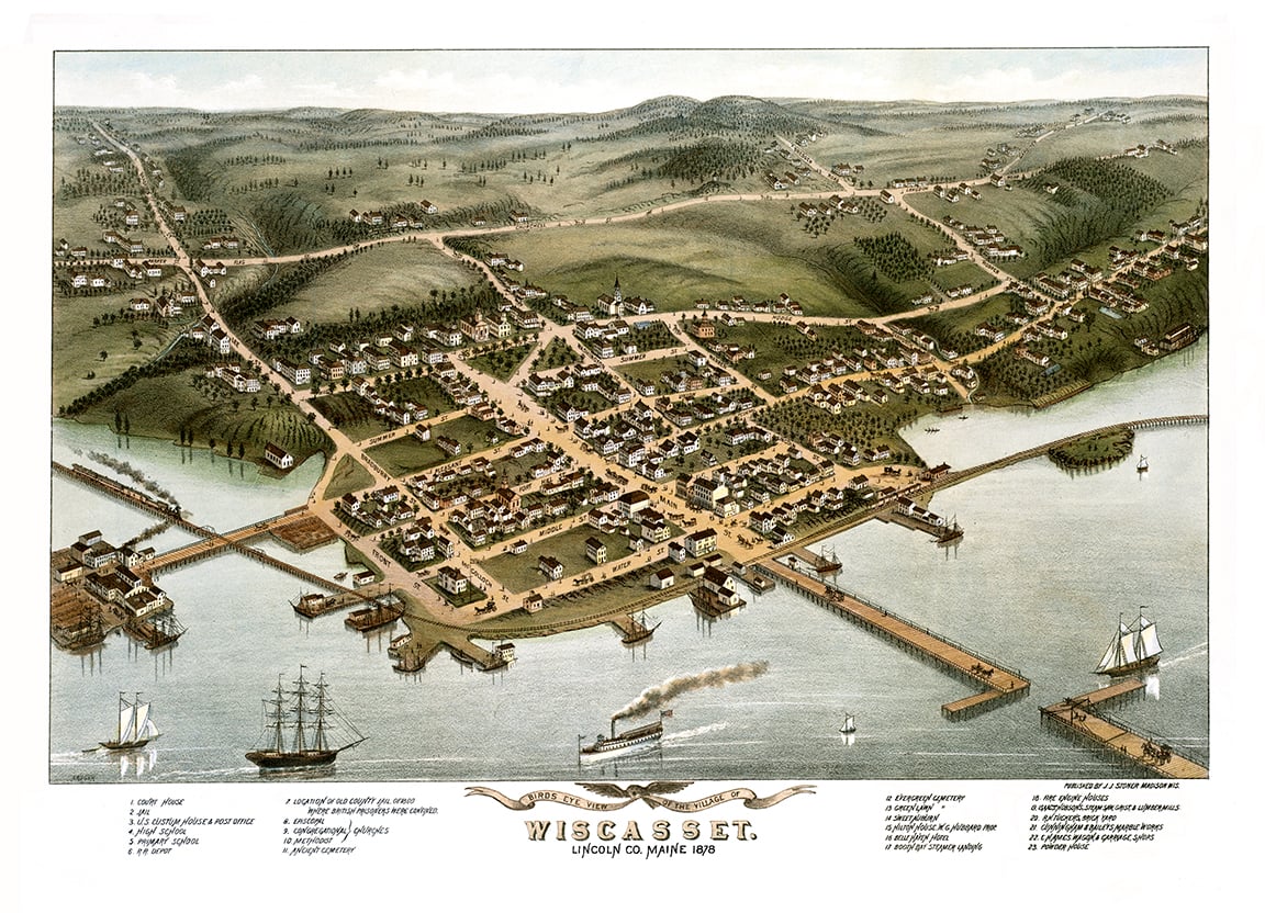 Wiscasset, Maine in 1878 - Bird's Eye View Map, Aerial, Panorama, Vintage, Antique, Reproduction, Giclée, Framable, Fine Art