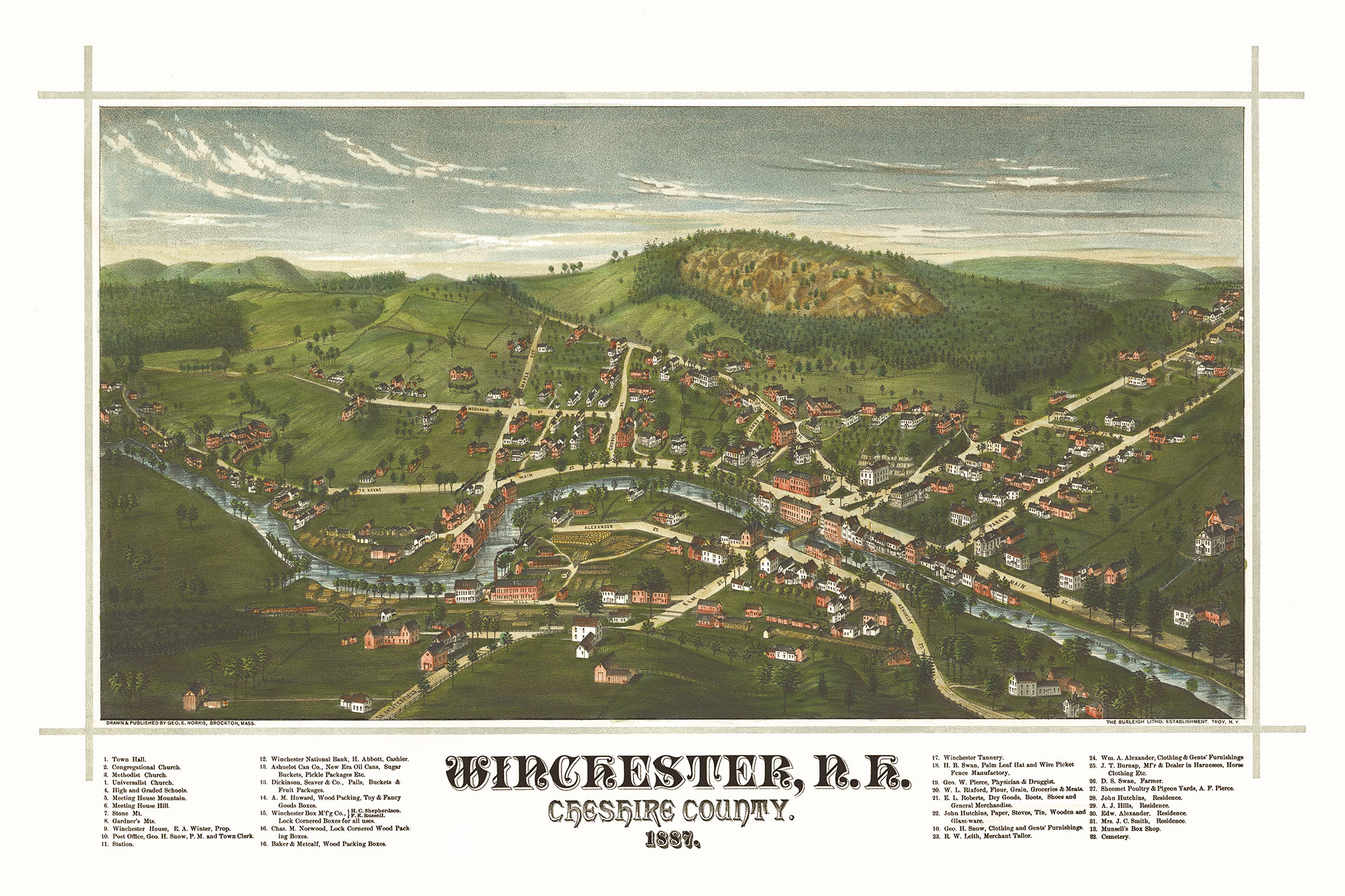 Winchester, NH in 1887 - Bird's Eye View Map, Aerial map, Panorama, Vintage map, Antique map, Reproduction, Giclée, Framable, Fine Art