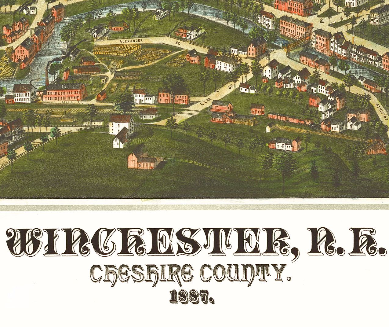 Beautiful, full color, bird's eye view map of Winchester, NH in 1887. Extremely fine detail.