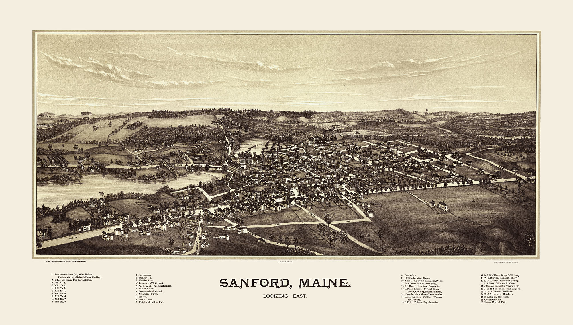 Sanford, Maine in 1889 - Bird's Eye View Map, Aerial, Panorama, Vintage, Antique, Reproduction, Giclée, Framable, Fine Art