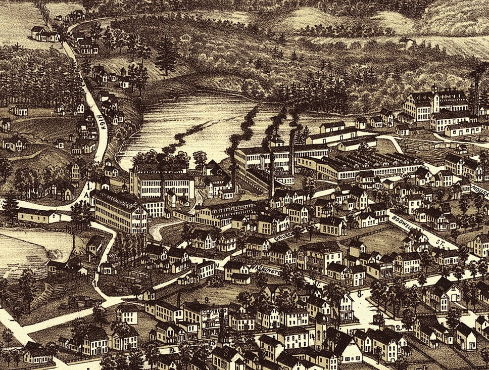 Sepia tone fine art reproduction of the Bird's Eye View of Sanford, Maine from 1889. Extremely fine detail.