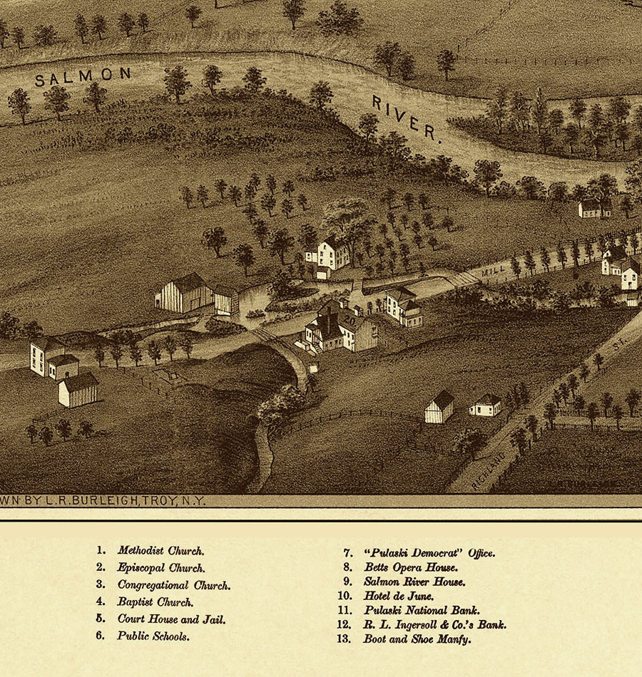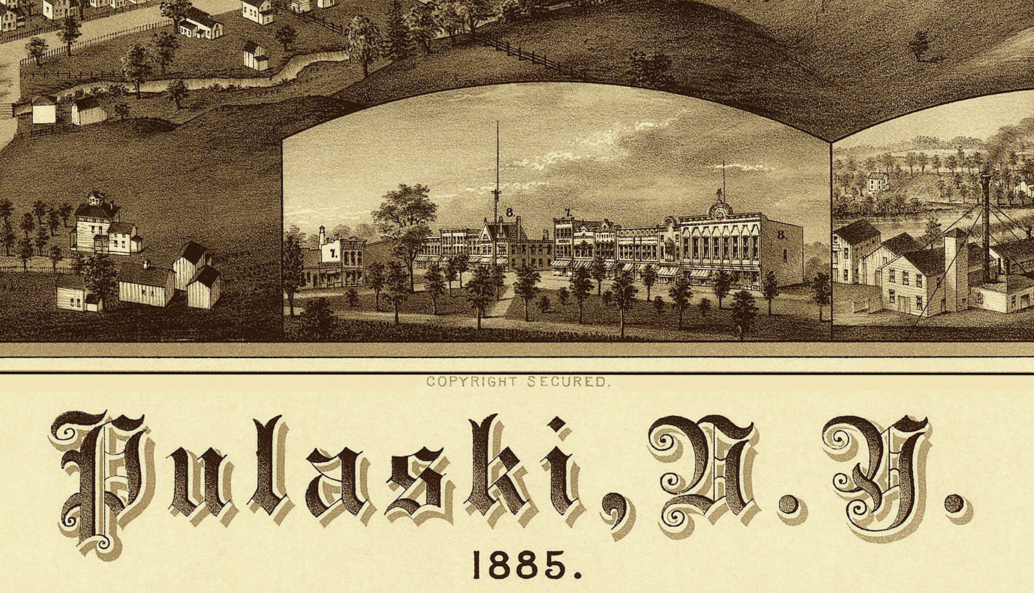 Pulaski, NY in 1885 - Bird's Eye View Map, Aerial, Panorama, Vintage, Antique, Reproduction, Giclée, Framable, Fine Art, Home Decor, History