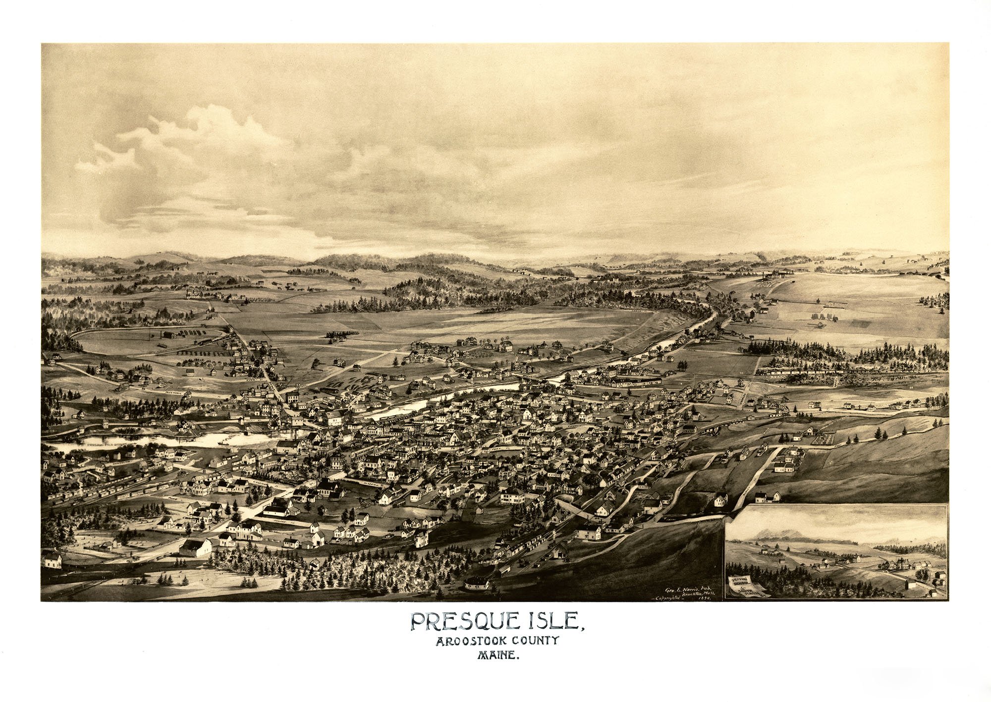 Presque Isle, Maine in 1894 - Bird's Eye View Map, Aerial, Panorama, Vintage, Antique, Reproduction, Giclée, Framable, Fine Art