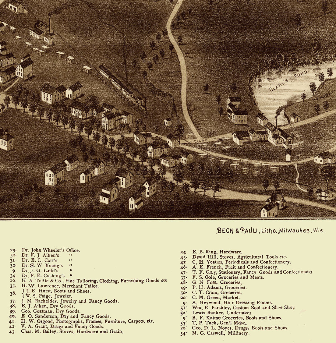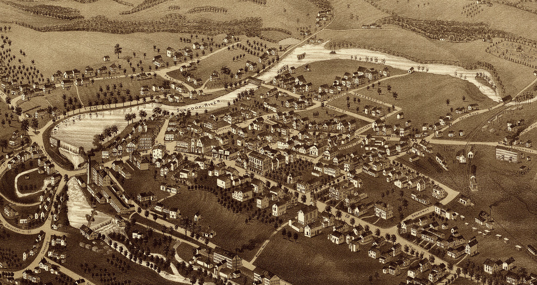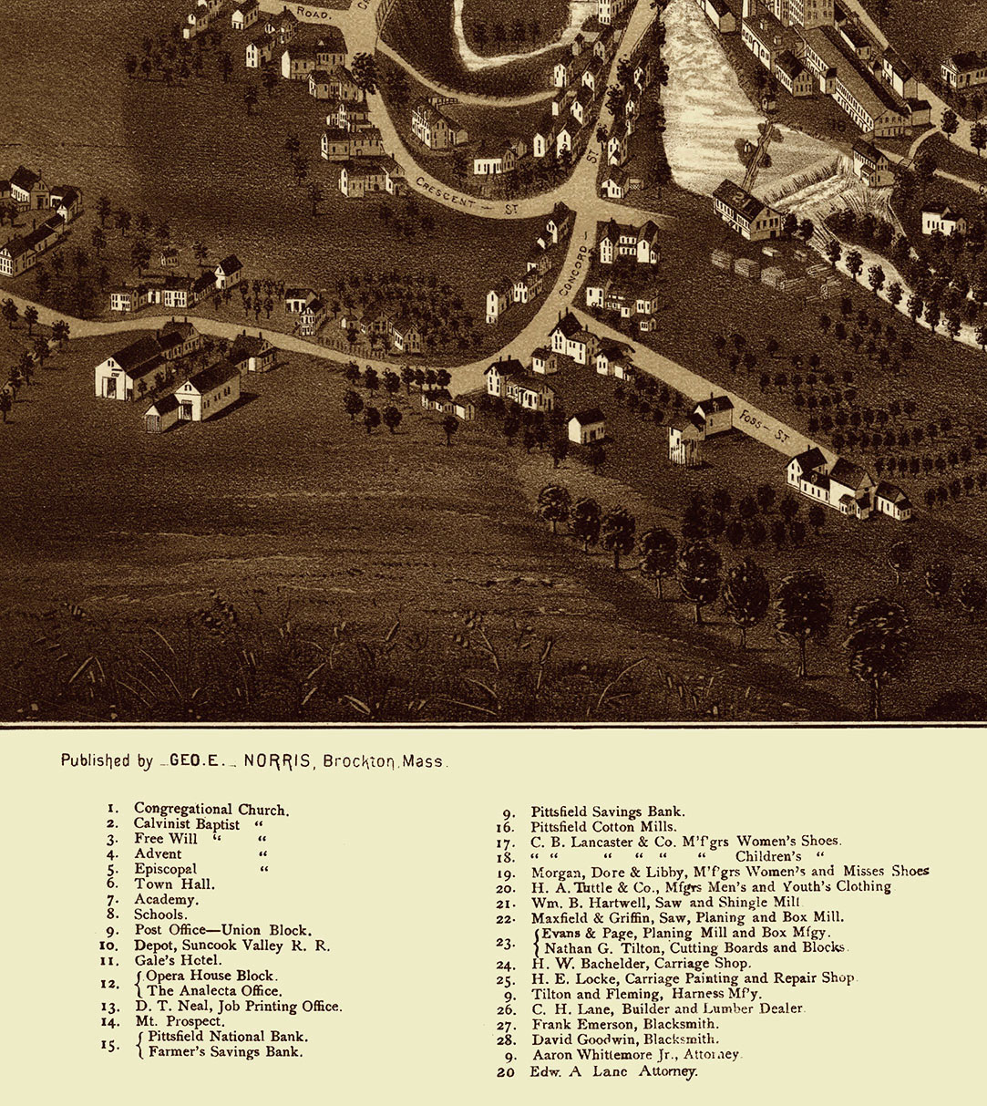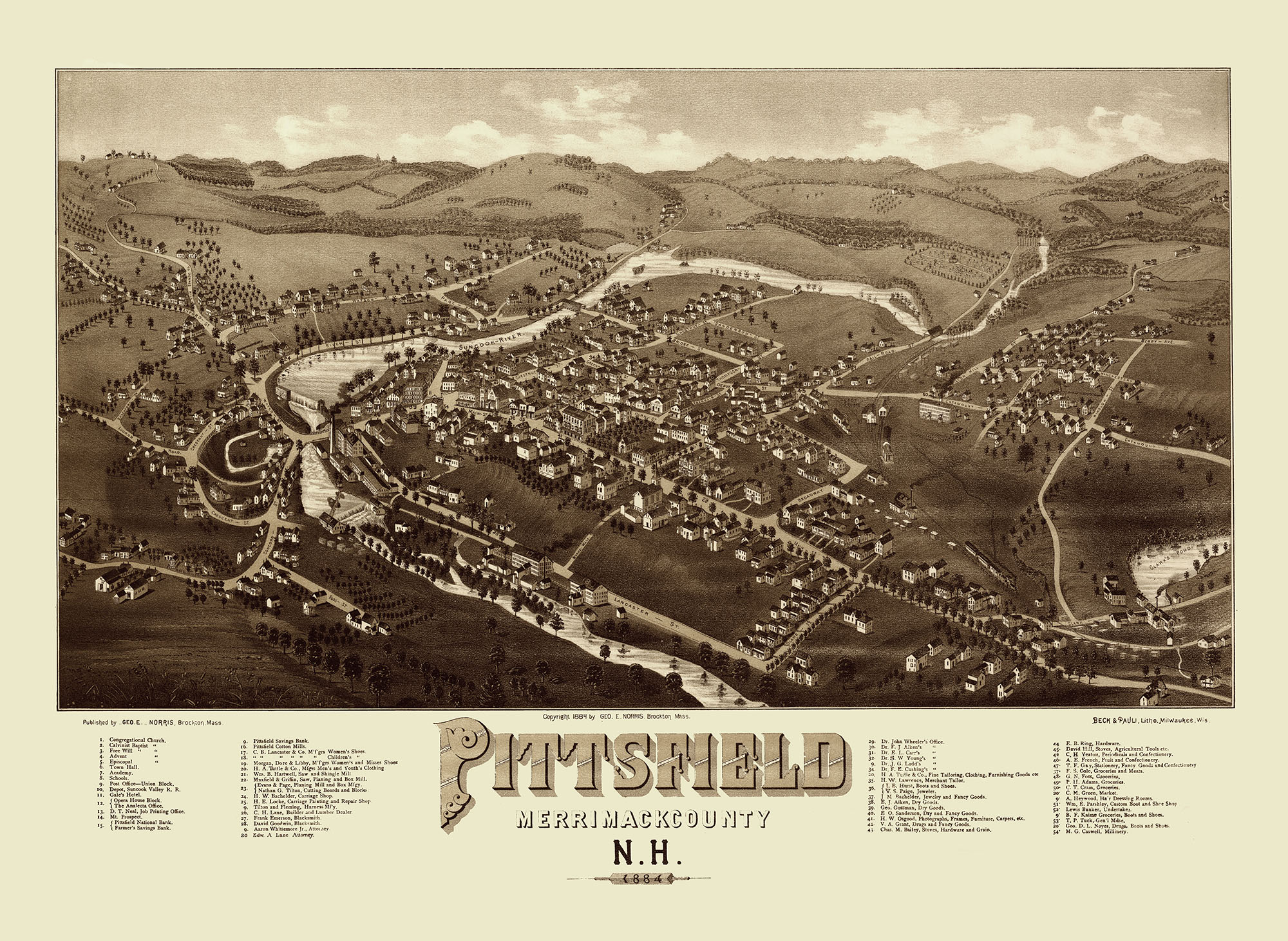 Sepia tone fine art map of Pittsfield, NH in 1884. Fine detail is remarkable.