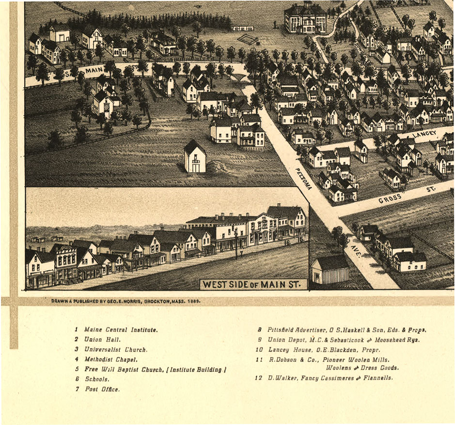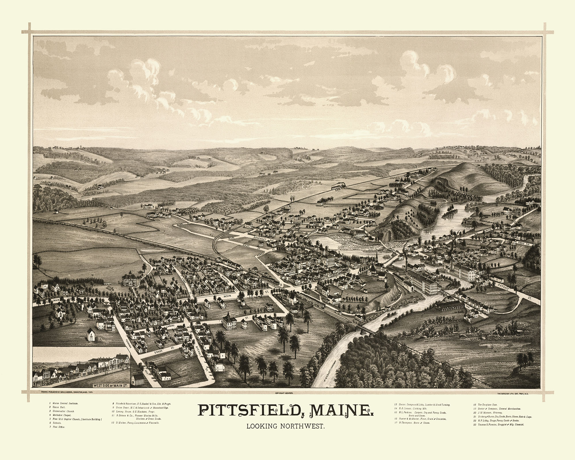 Pittsfield, Maine in 1889 - Bird's Eye View Map, Aerial, Panorama, Vintage, Antique, Reproduction, Giclée, Framable, Fine Art