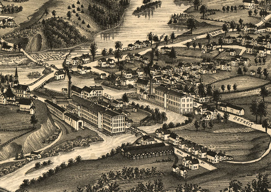 Sepia tone fine art reproduction of the Bird's Eye View of Pittsfield, Maine from 1889. Extremely fine detail.