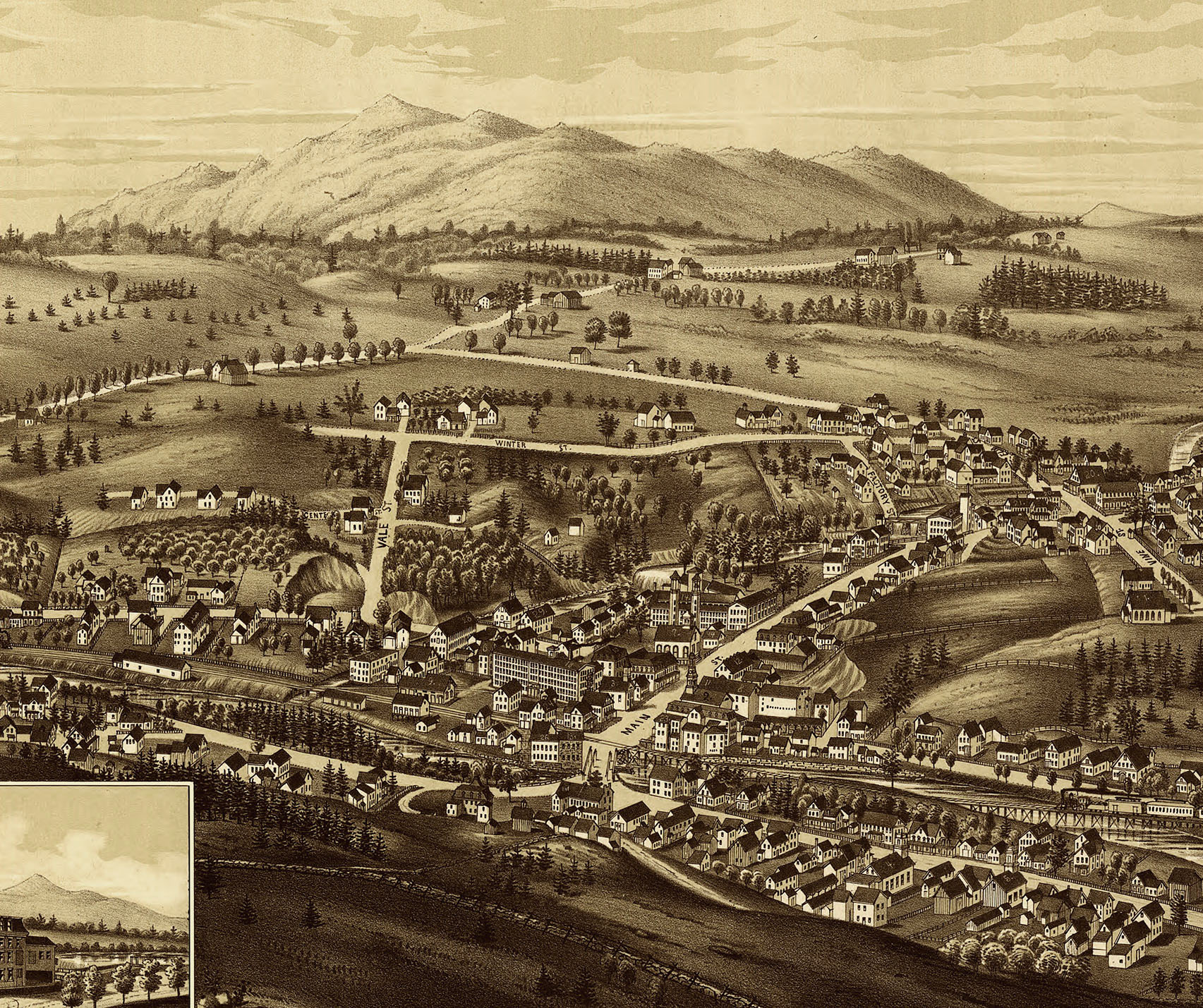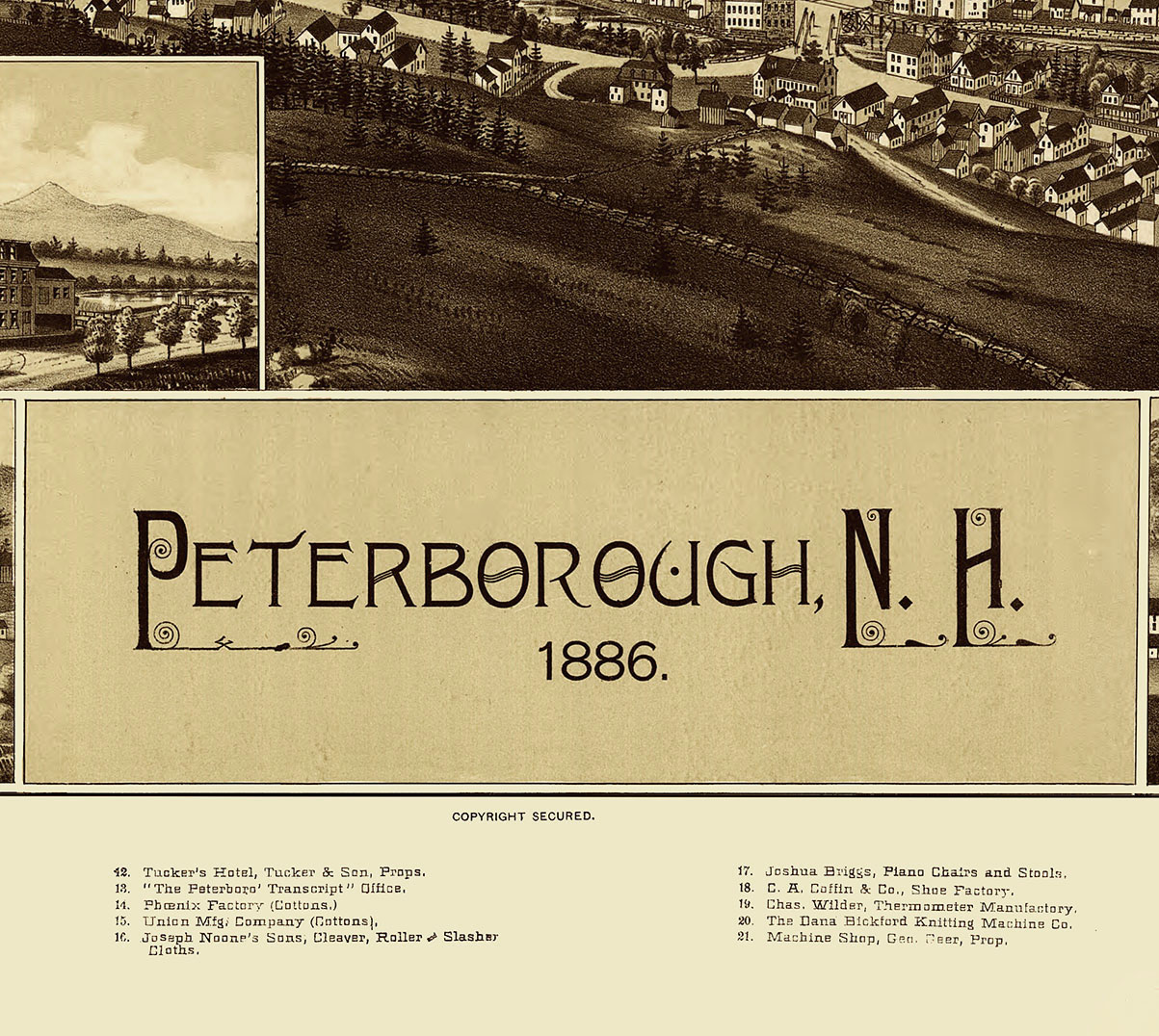 Peterborough, NH in 1886 - Bird's Eye Map, Aerial map, Panorama map, Vintage map, Antique map, Reproduction, Giclée, Framable map, Fine Art
