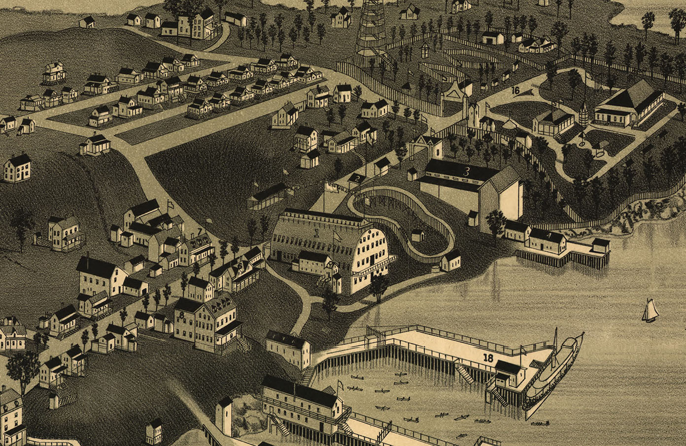 Sepia tone fine art reproduction of the Bird's Eye View of Peak's Island in Portland Harbor, Maine from 1886. Extremely fine detail.