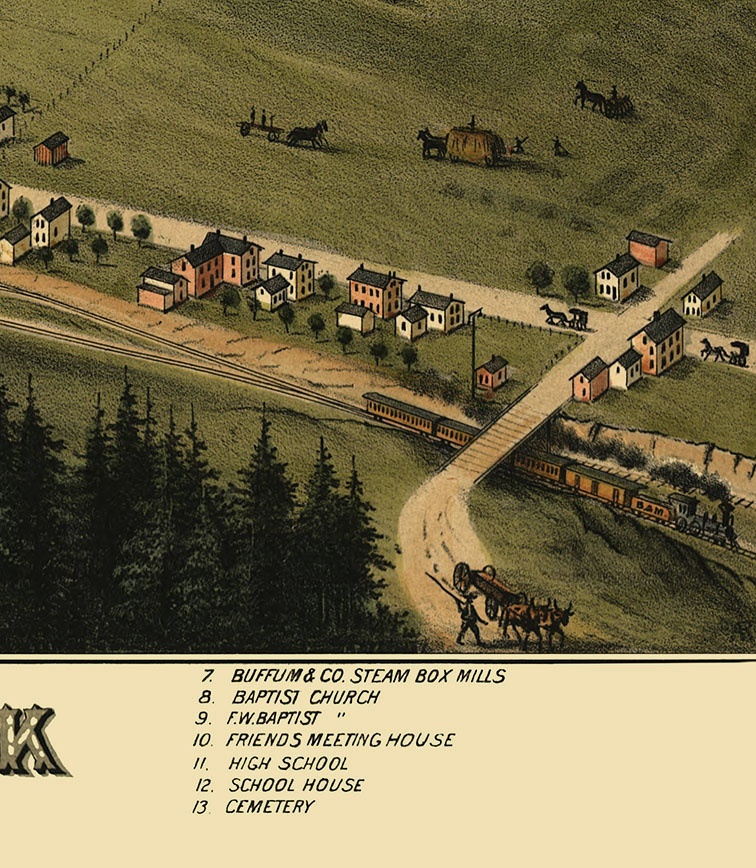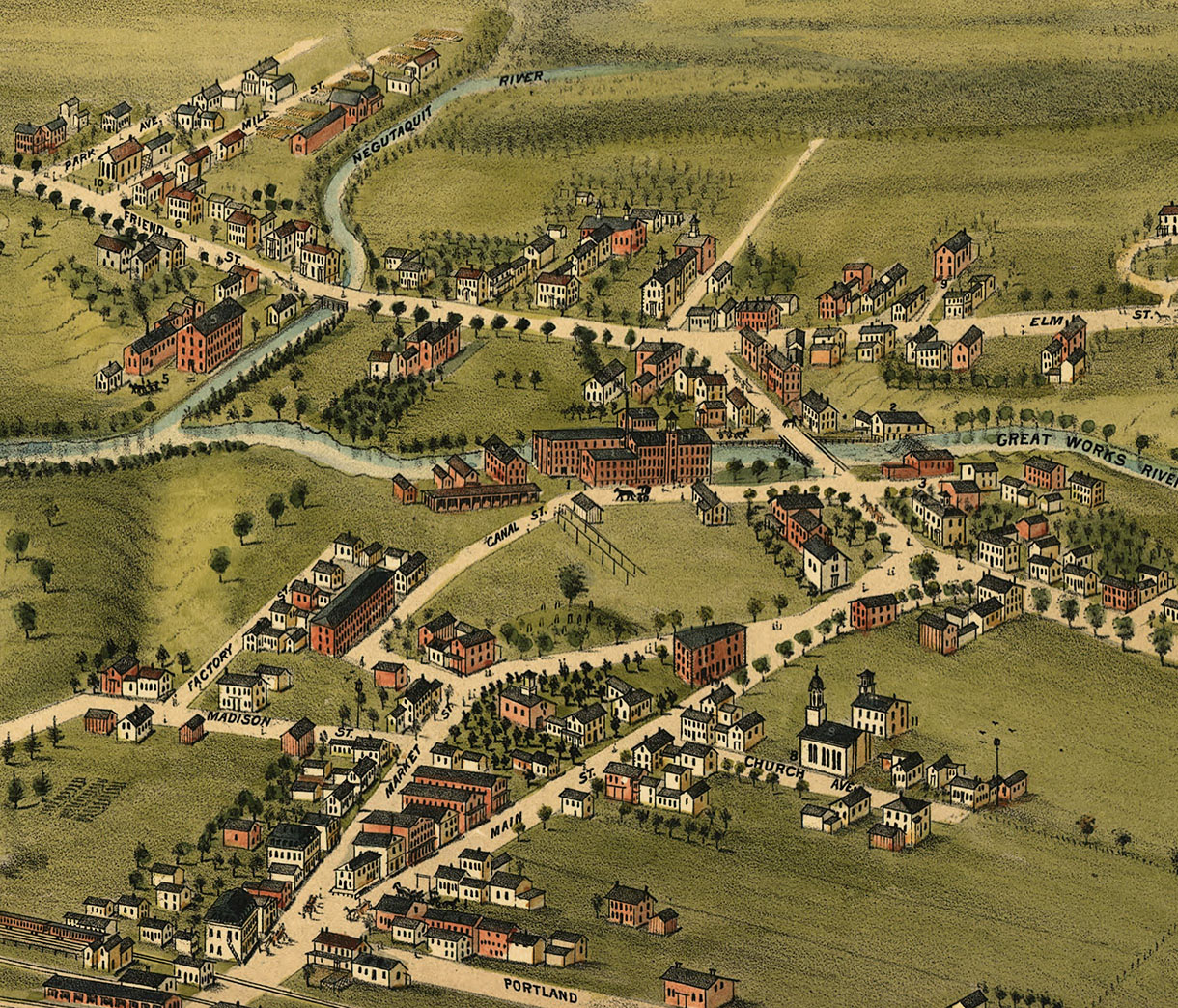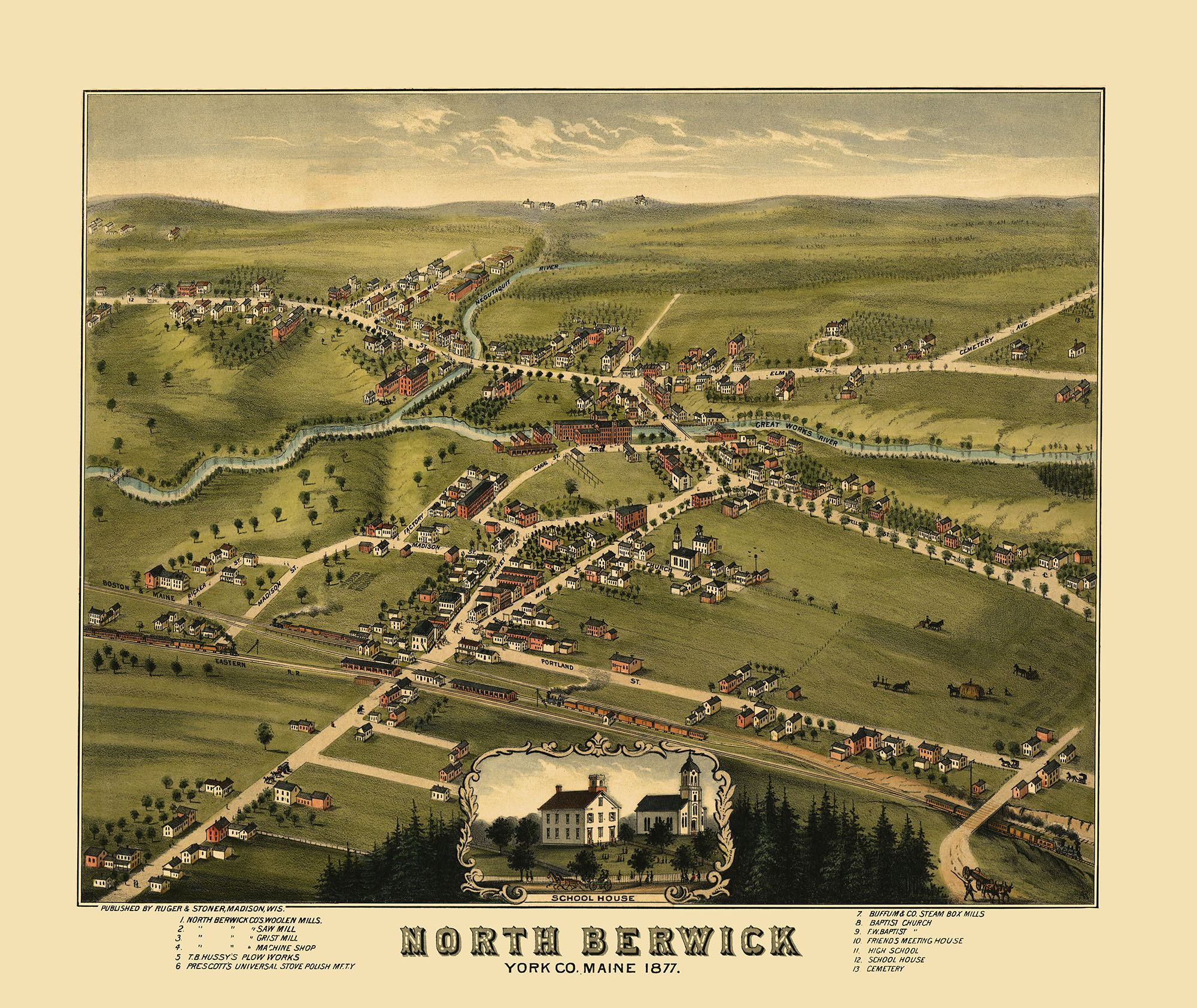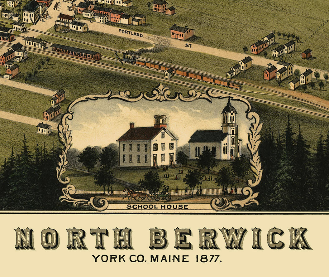 North Berwick, Maine in 1877 - Bird's Eye View Map, Aerial, Panorama, Vintage, Antique, Reproduction, Giclée, Framable, Fine Art