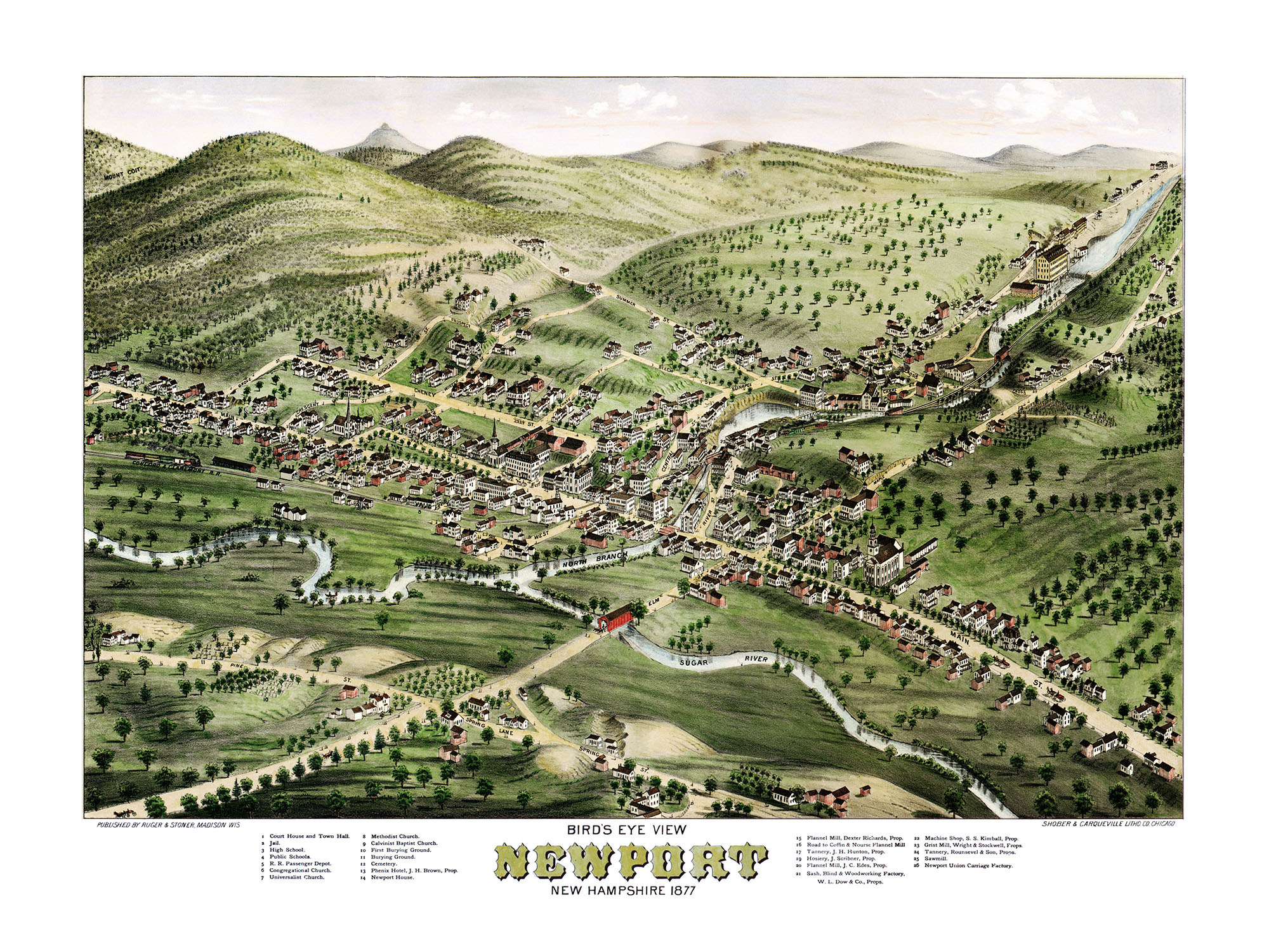 Newport, NH in 1877 - Bird's Eye View Map, Aerial, Panorama, Vintage, Antique, Reproduction, Giclée, Framable, Fine Art