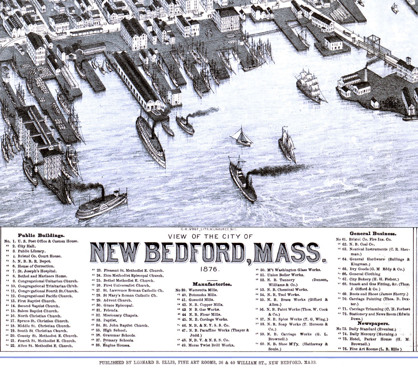 New Bedford, MA in 1876 - Bird's Eye View Map, Aerial Map, Panorama, Vintage Map, Antique Map, Reproduction, Giclée, Framable Map, Fine Art