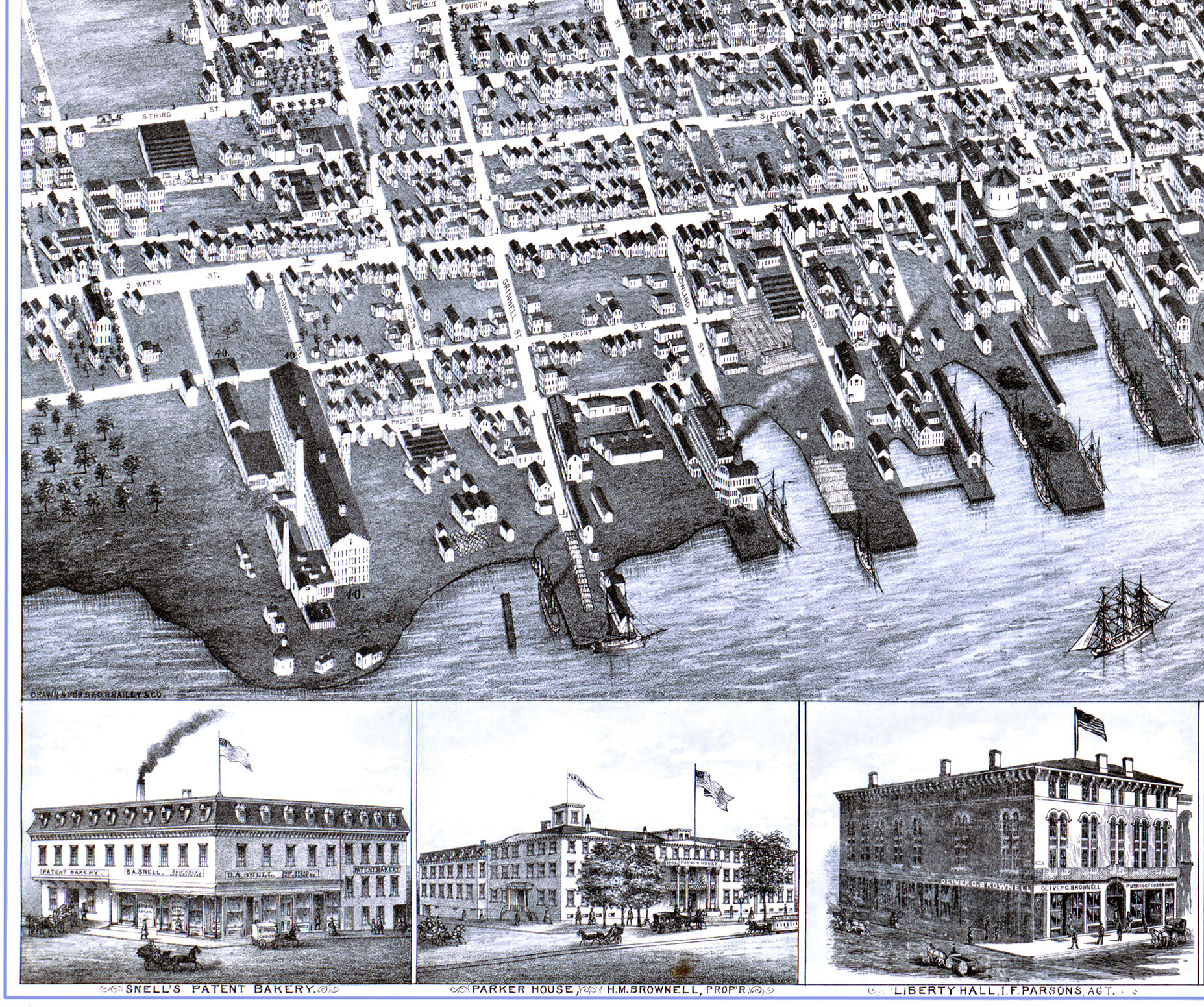 Brilliant duo-tone fine art illustration of New Bedford, MA in 1876. Fine detail is remarkable. Extremely fine detail.