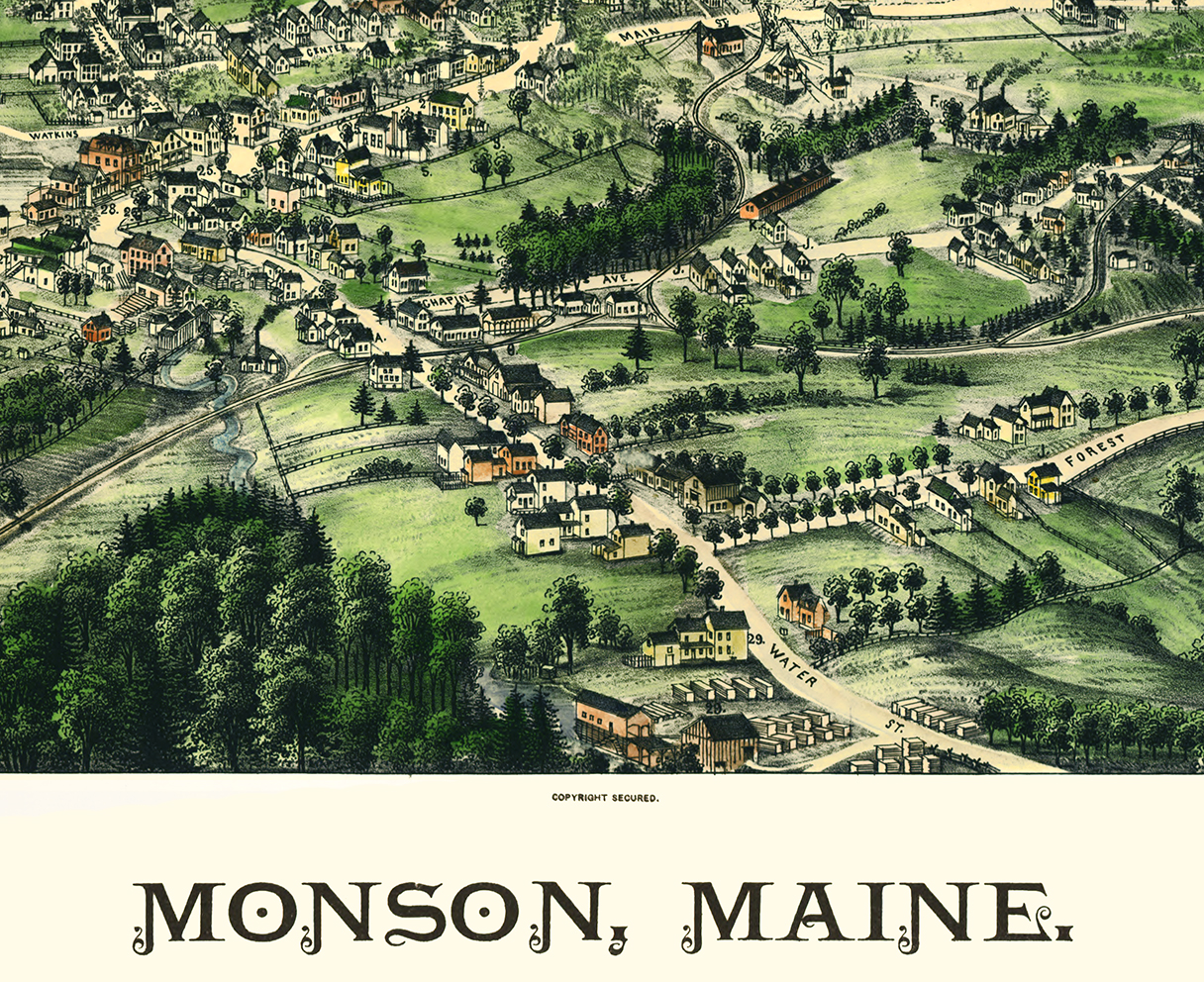 Extremely fine reproduction of "Bird's Eye" map of Monson, Maine in 1889. Brilliant colors, extremely fine detail. This is exceptionally clean for a 19th century map.
