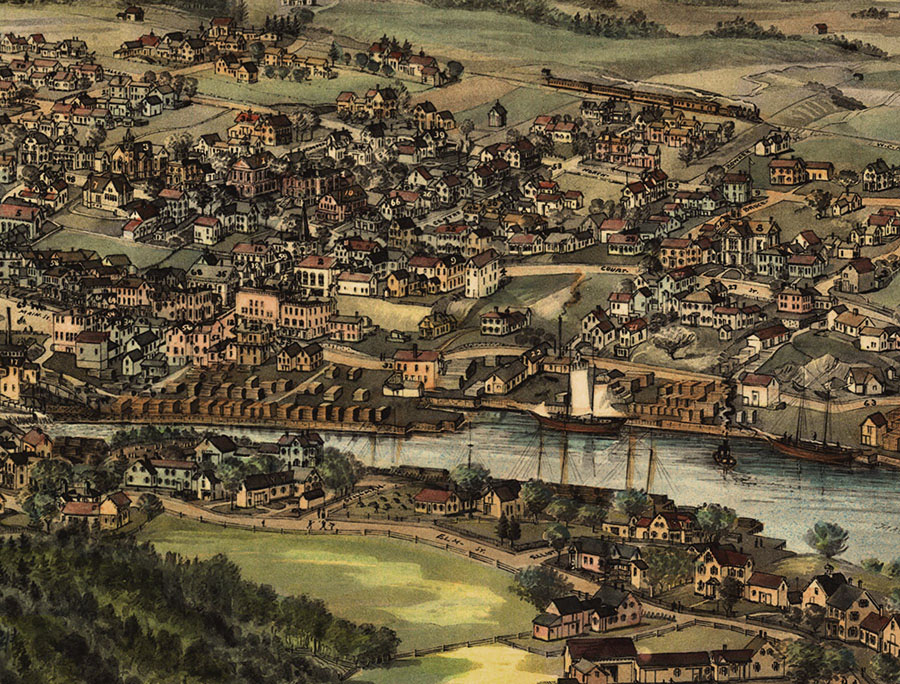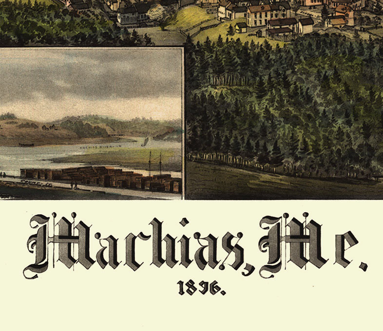 Machias, Maine in 1896 - Bird's Eye View Map, Aerial, Panorama, Vintage, Antique, Reproduction, Giclée, Framable, Fine Art
