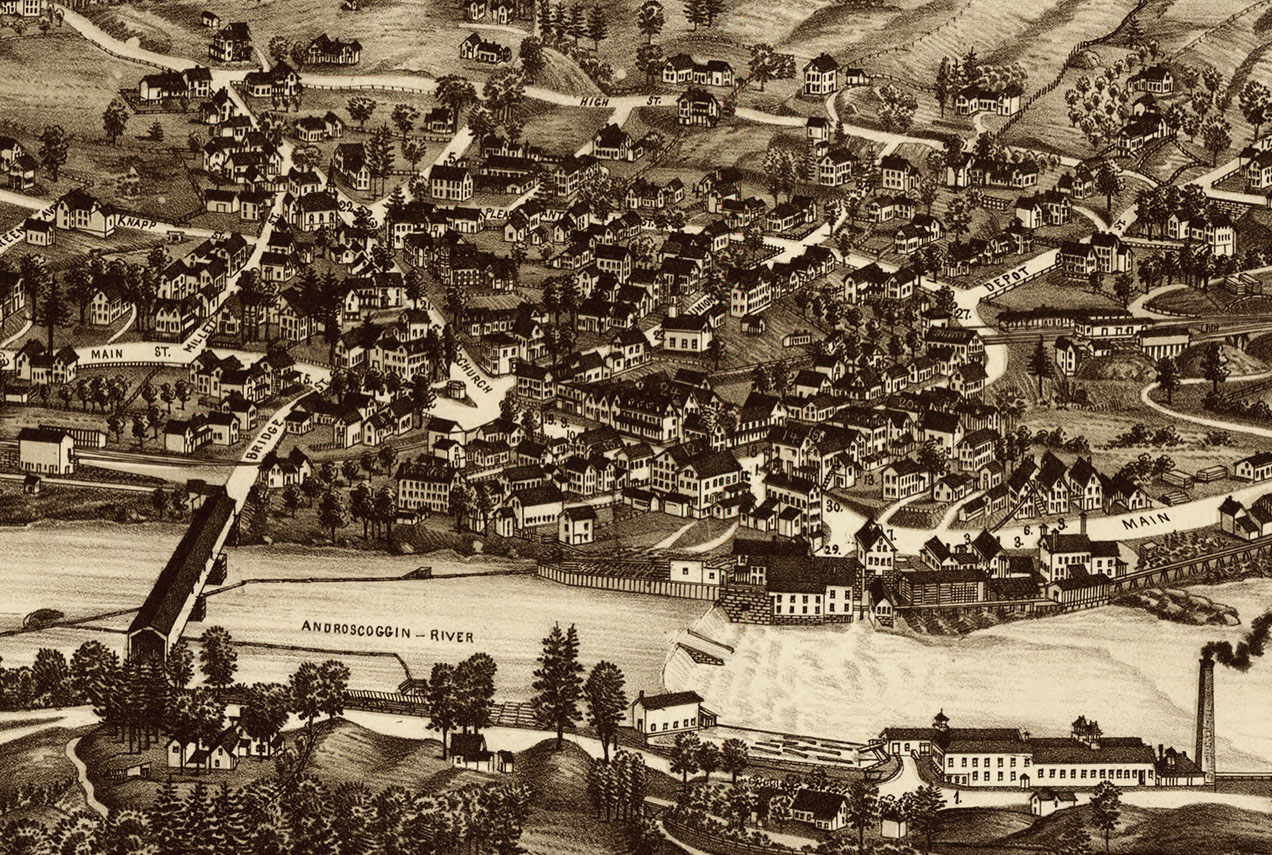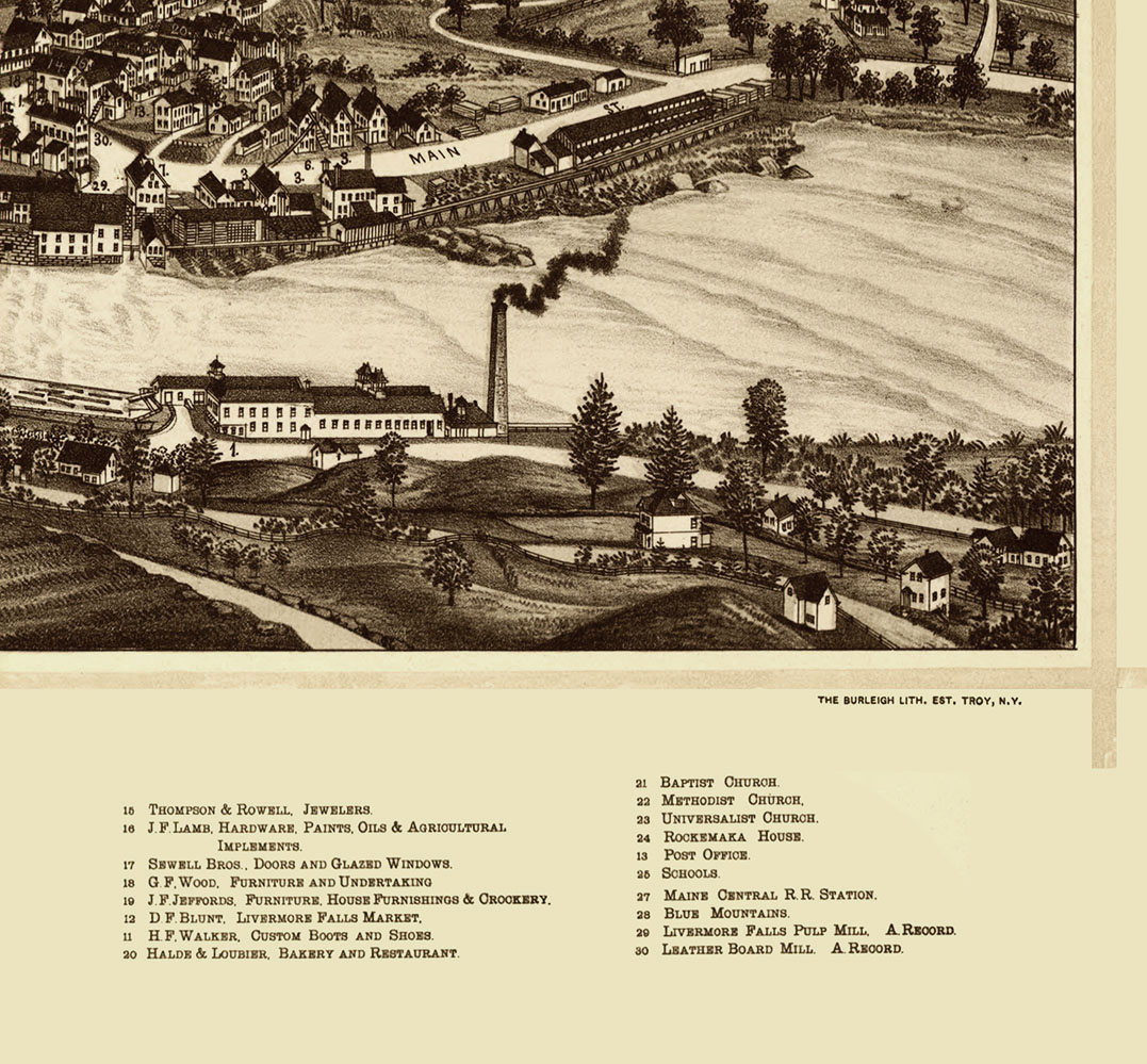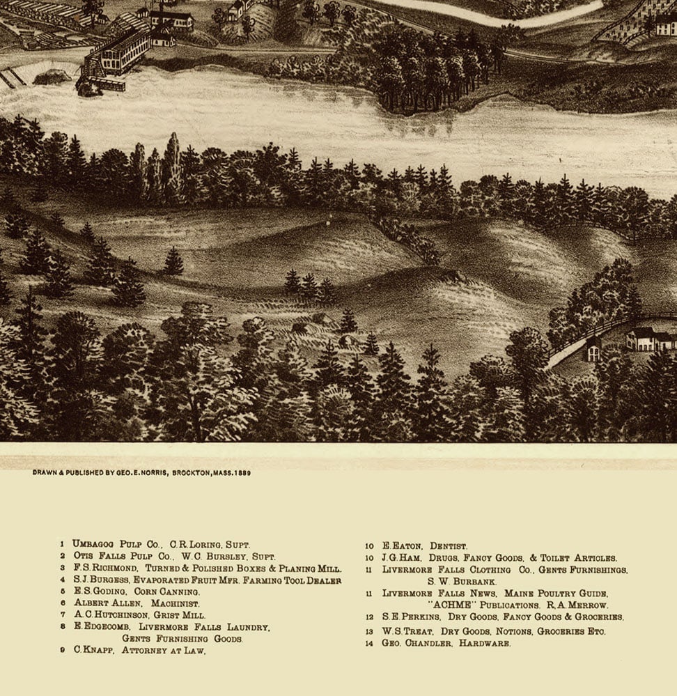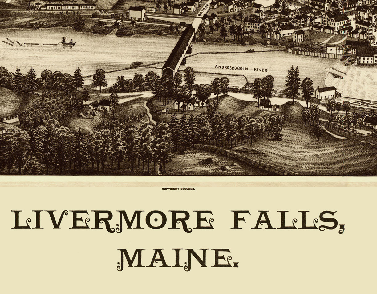 Livermore Falls, ME in 1889 - Bird's Eye View Map, Aerial, Panorama, Vintage, Antique, Reproduction, Giclée, Framable, Fine Art, Home Decor