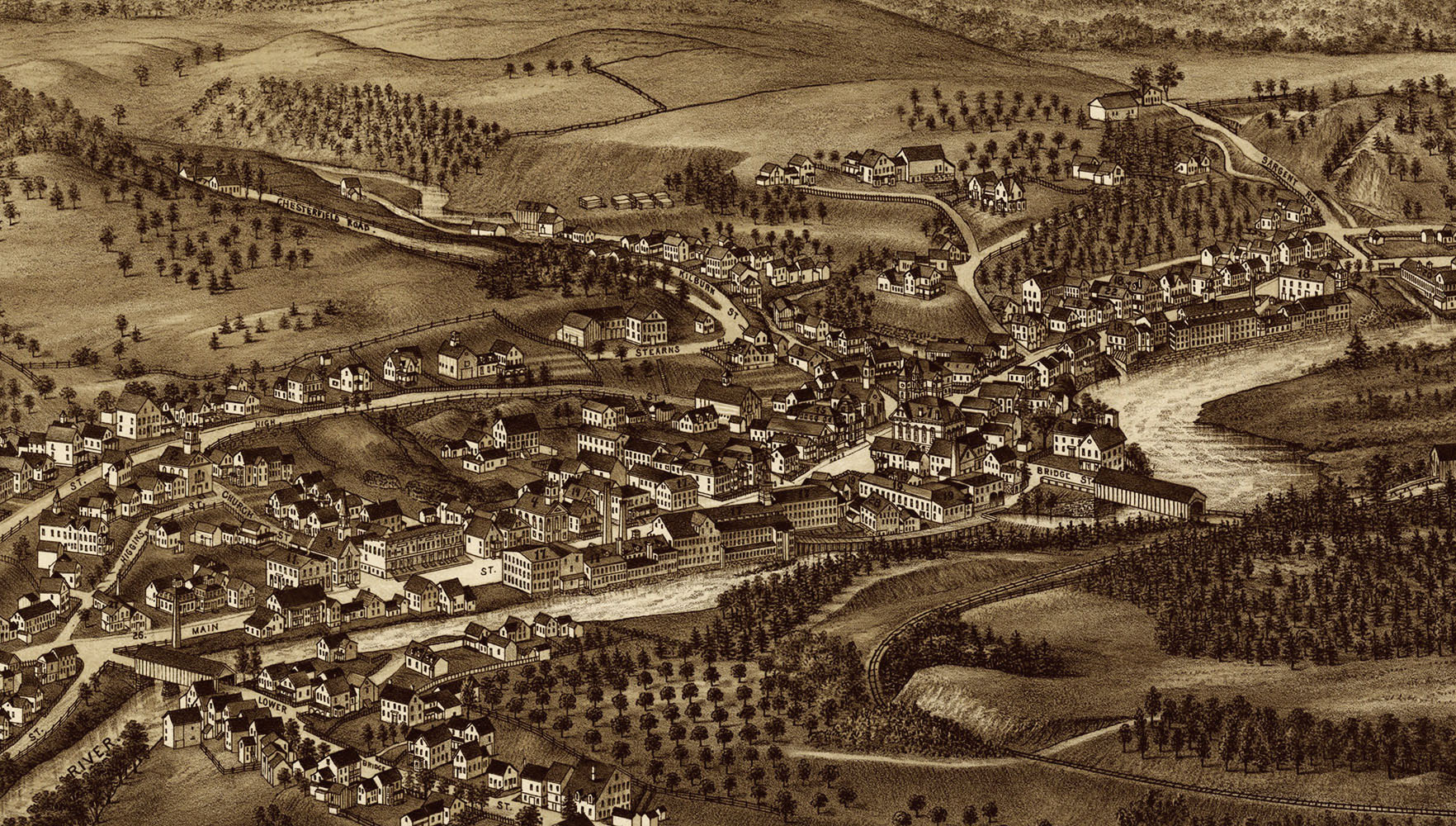 Sepia tone fine art map of Hinsdale, NH in 1886. Extremely fine detail.
