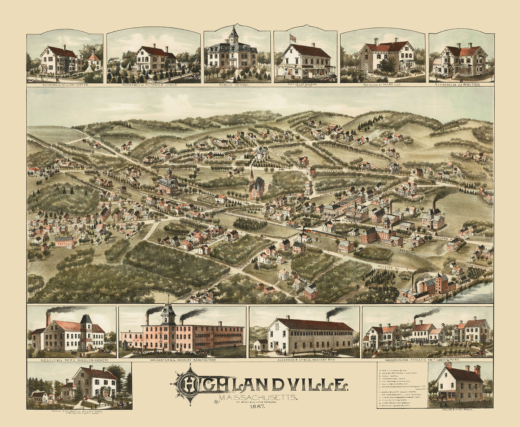 Highlandville, MA (Village of Needham) in 1887 - Bird's Eye View, Aerial, Panorama, Vintage, Antique, Reproduction, Giclée, Framable, Art