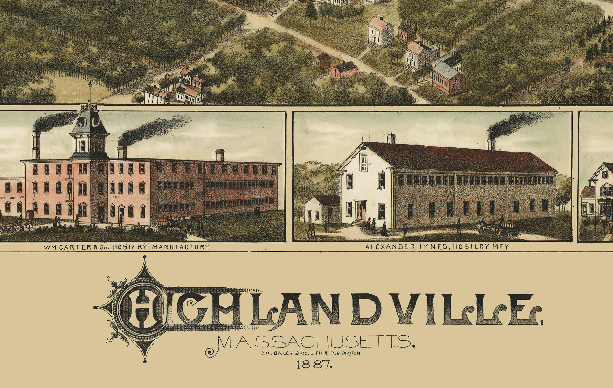 Full color fine art map of Highlandville, MA (Village of Needham) in 1887. Brilliant colors, extremely fine detail.