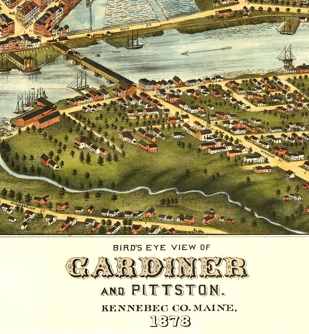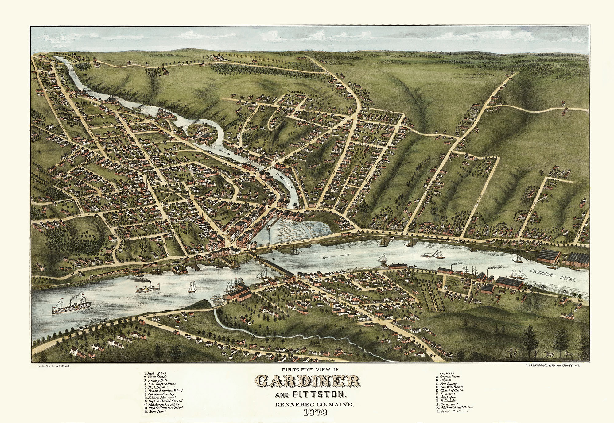 Extremely fine, full color reproduction of "Bird's Eye" map of Gardiner and Pittston, Maine from 1878. Extremely fine detail.