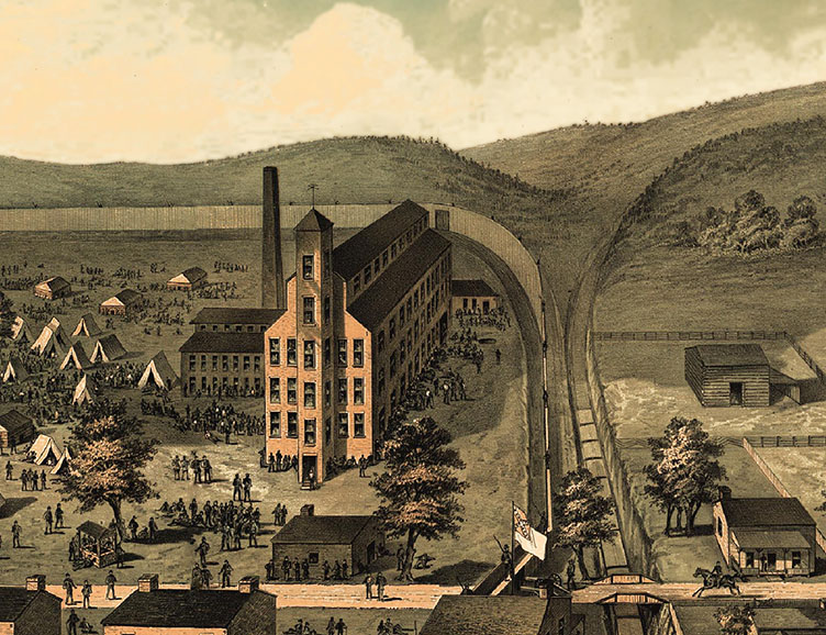 Full color bird's eye view map of CSA Prison Pen, Salisbury NC 1864. Extremely fine detail.