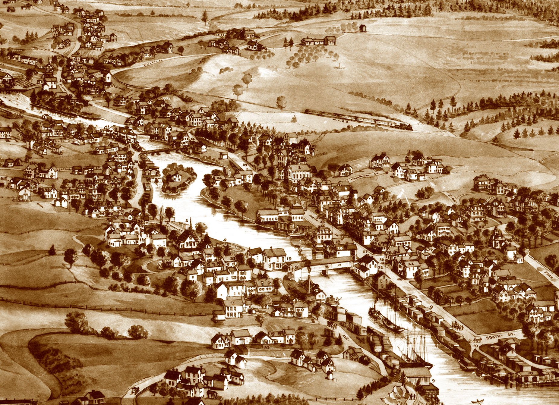 Sepia tone fine art reproduction of the Bird's Eye View of Cherryfield, Maine from 1896. Extremely fine detail.
