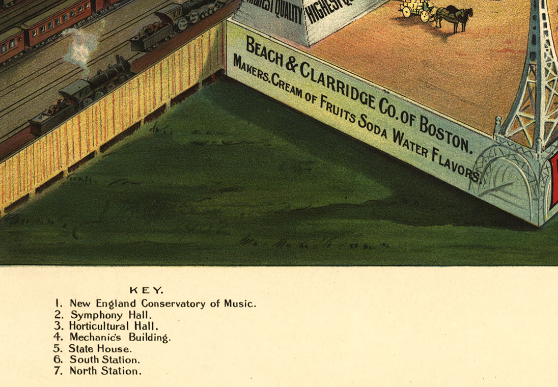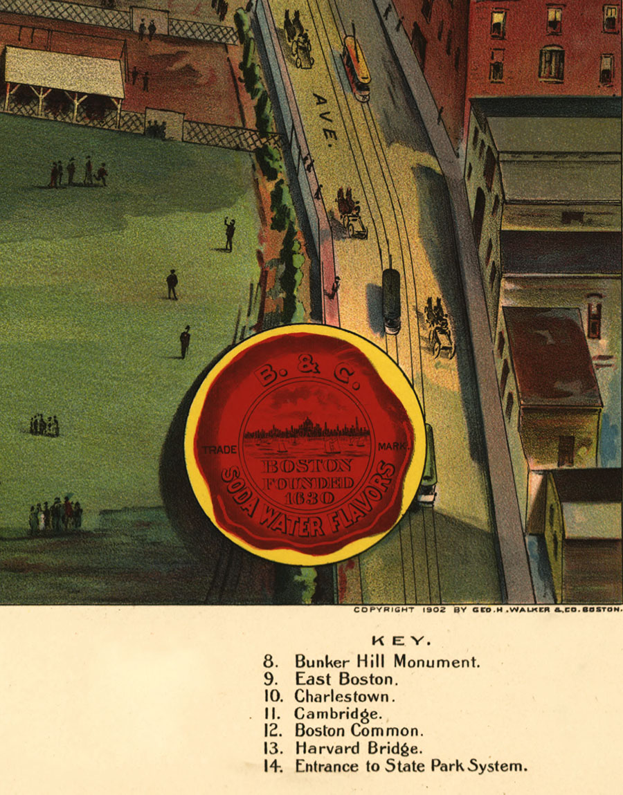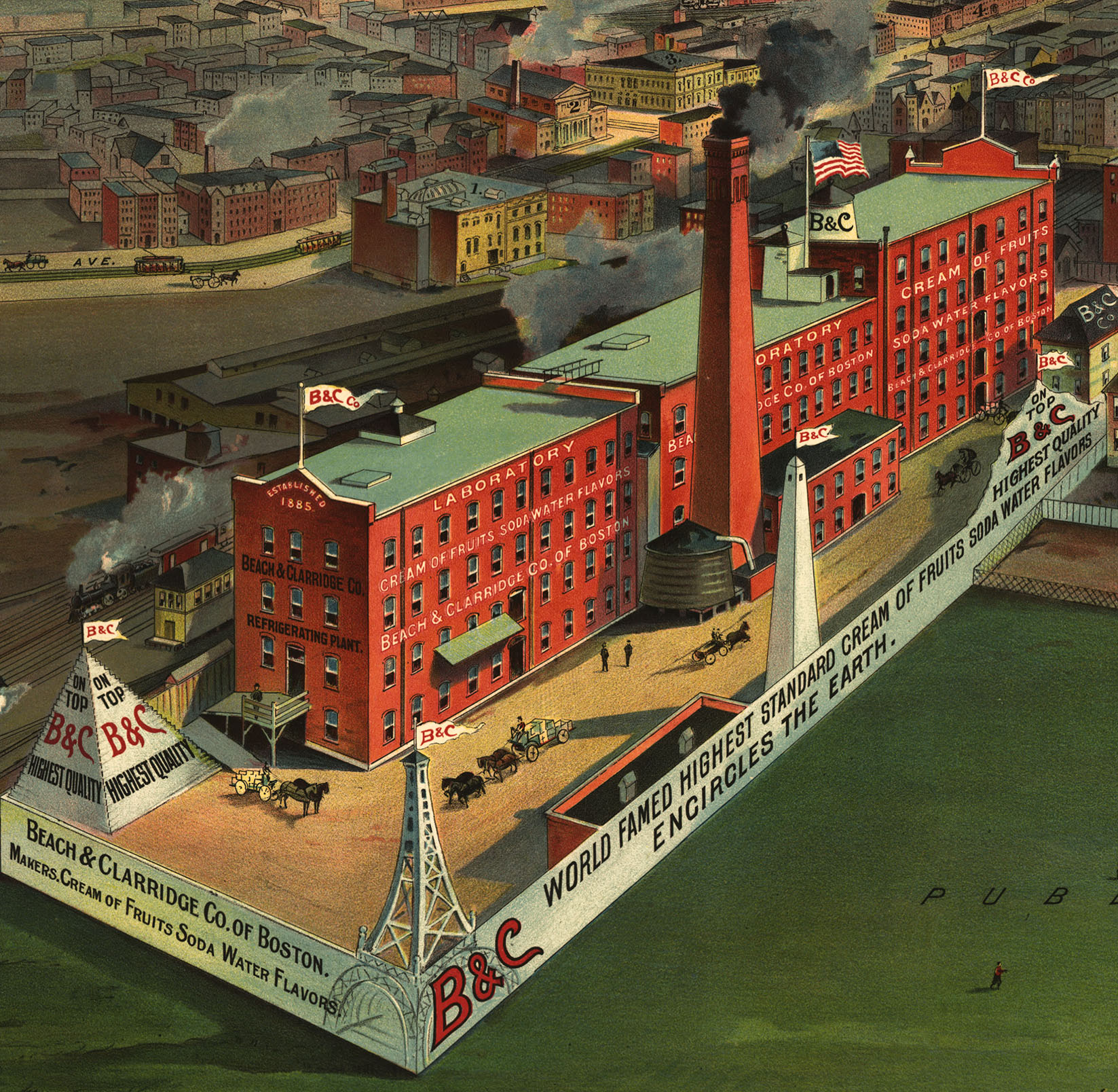 Full color fine art map of Boston, MA in 1902. Advertising for Beach & Clarridge Co. of Boston, Makers of Fine Soda Water Flavors.Vibrant colors; detail is remarkable.
