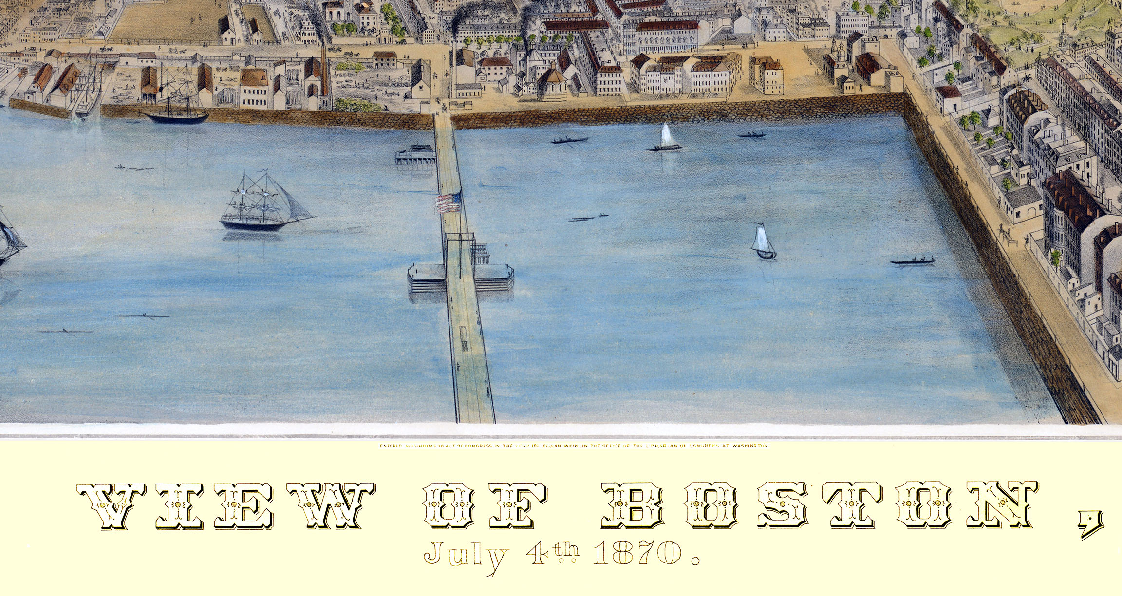 Full color fine art map of Boston, MA in 1870. This map was specifically commissioned to celebrate Independence Day in 1870. Brilliant colors, ships in the harbor, neighboring island, all the good stuff!