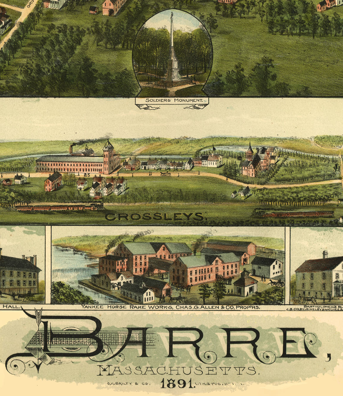 Full color fine art map of Barre, MA in 1891. Brilliant colors, depictions of stately homes, etc.