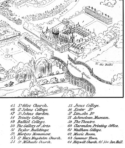 Black and White Key (or Legend) for the bird's eye map of Oxford, England: The City and the University in 1850.
