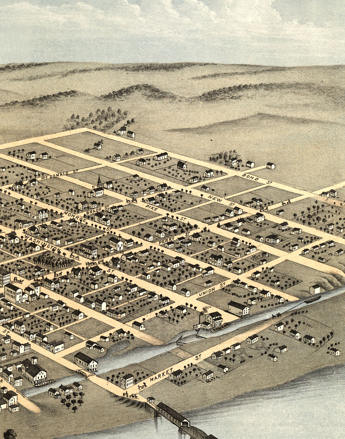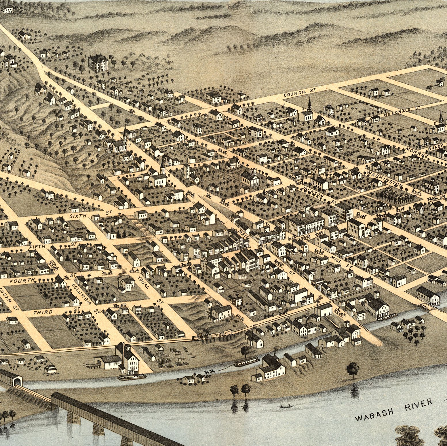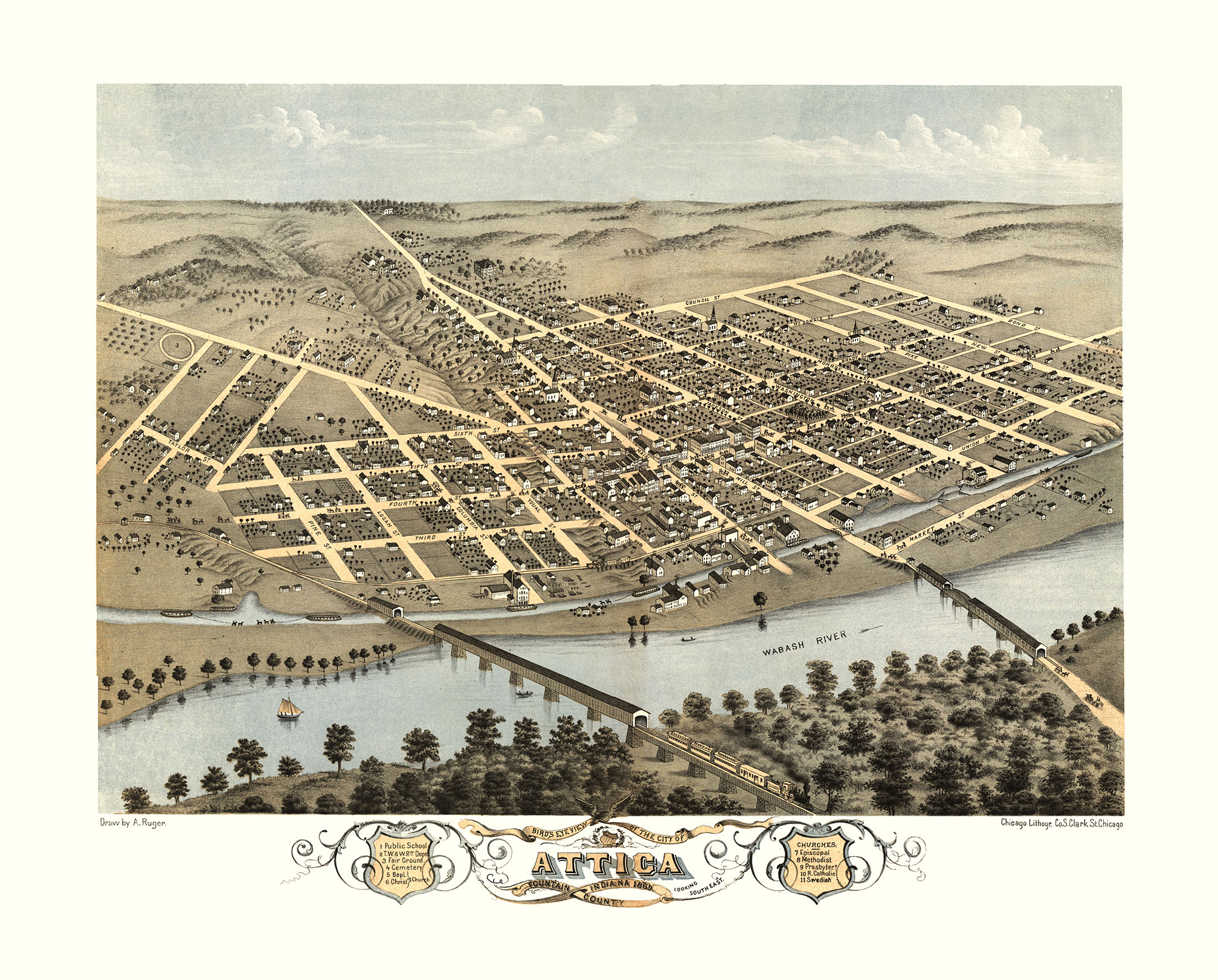 Attica, IN in 1869 - Bird's Eye View Map, Aerial Map, Panorama, Vintage map, Antique map, Reproduction, Giclée, Framable map, Fine Art