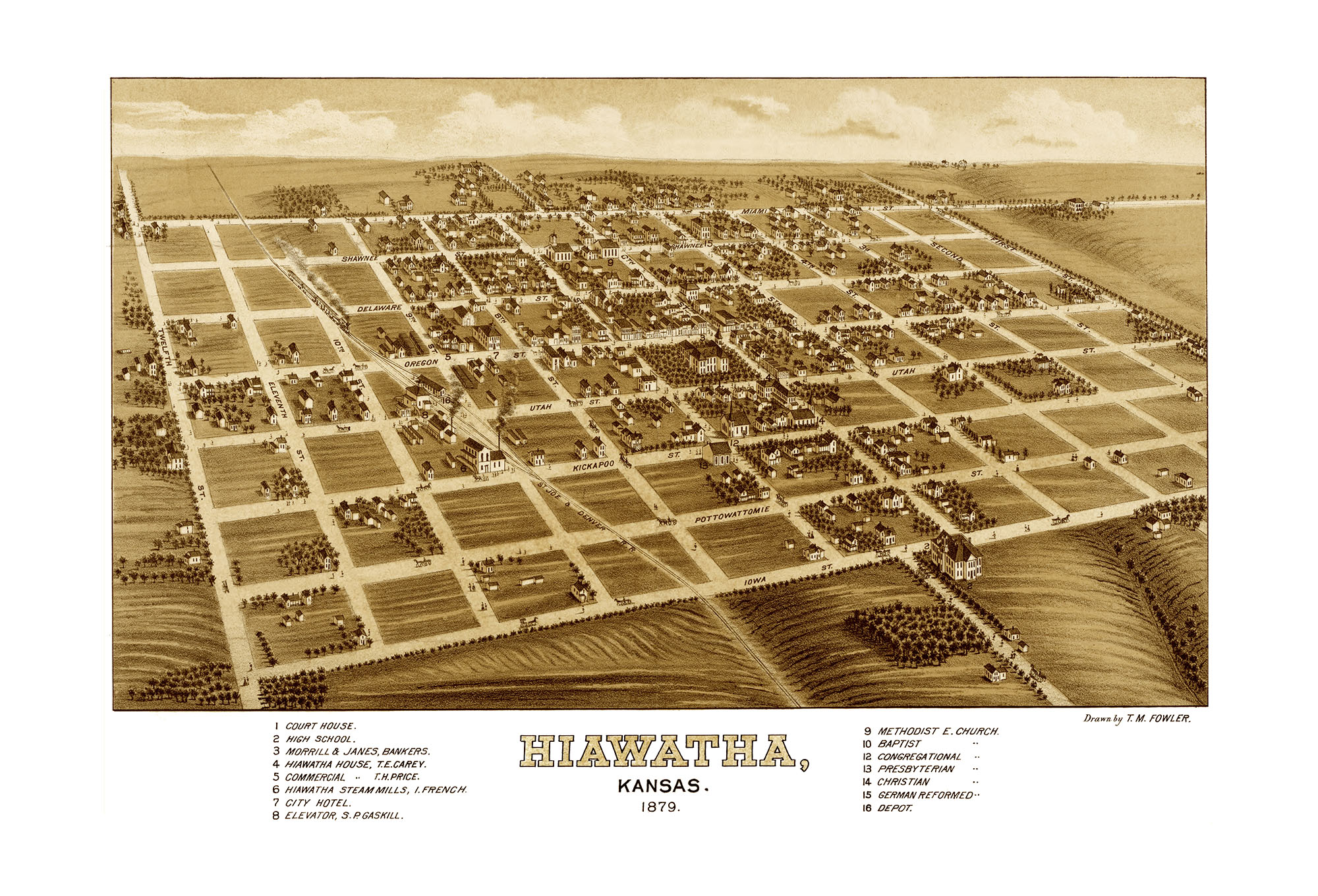 Hiawatha, KS in 1879 - Bird's Eye View Map, Aerial Map, Panorama, Vintage map, Antique map, Reproduction, Giclée, Framable map, Fine Art