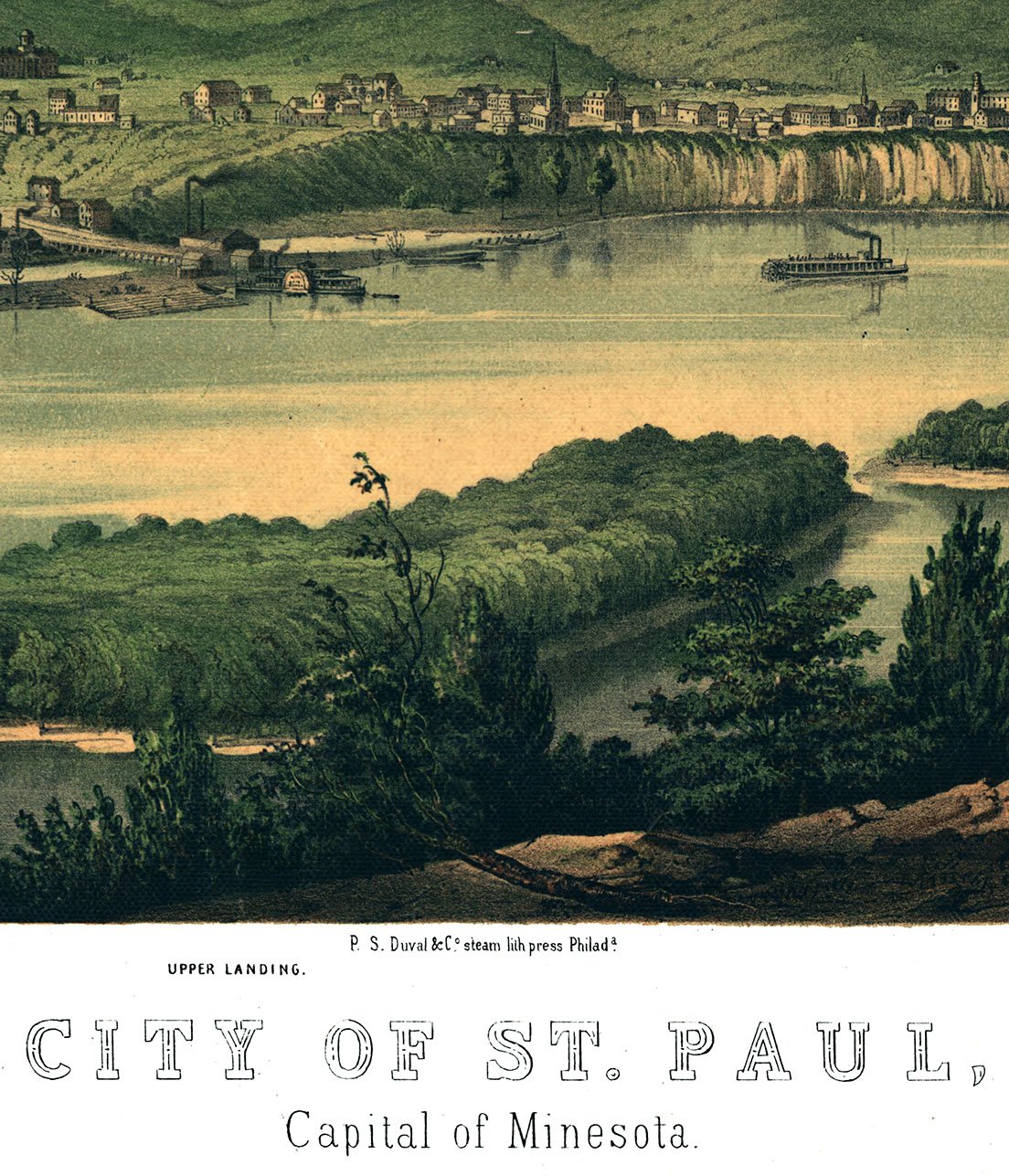 Full color fine art map of St. Paul, MN in 1853. Brilliant color, fine detail is remarkable.