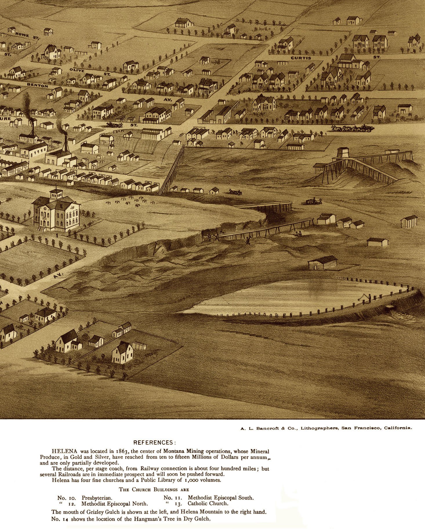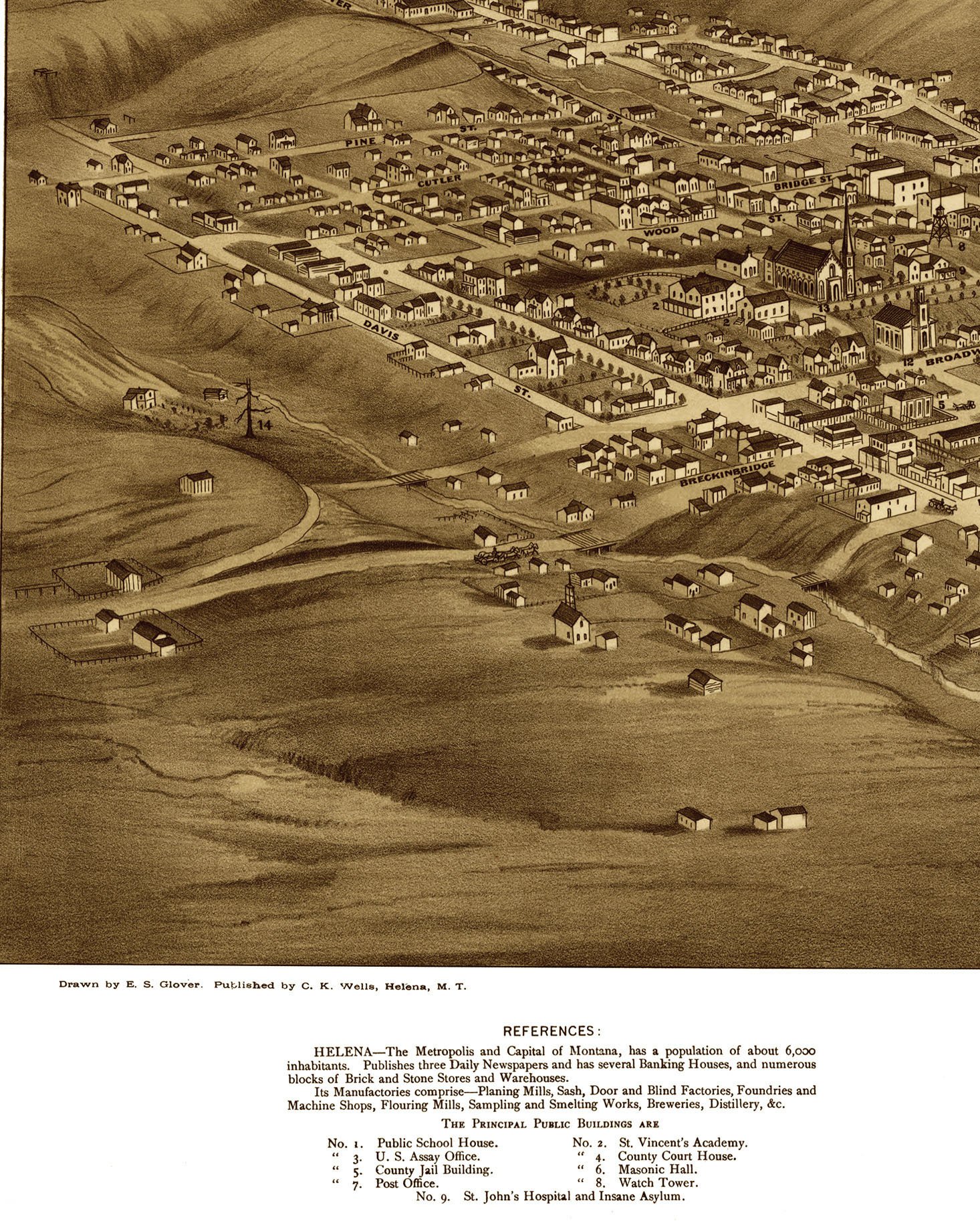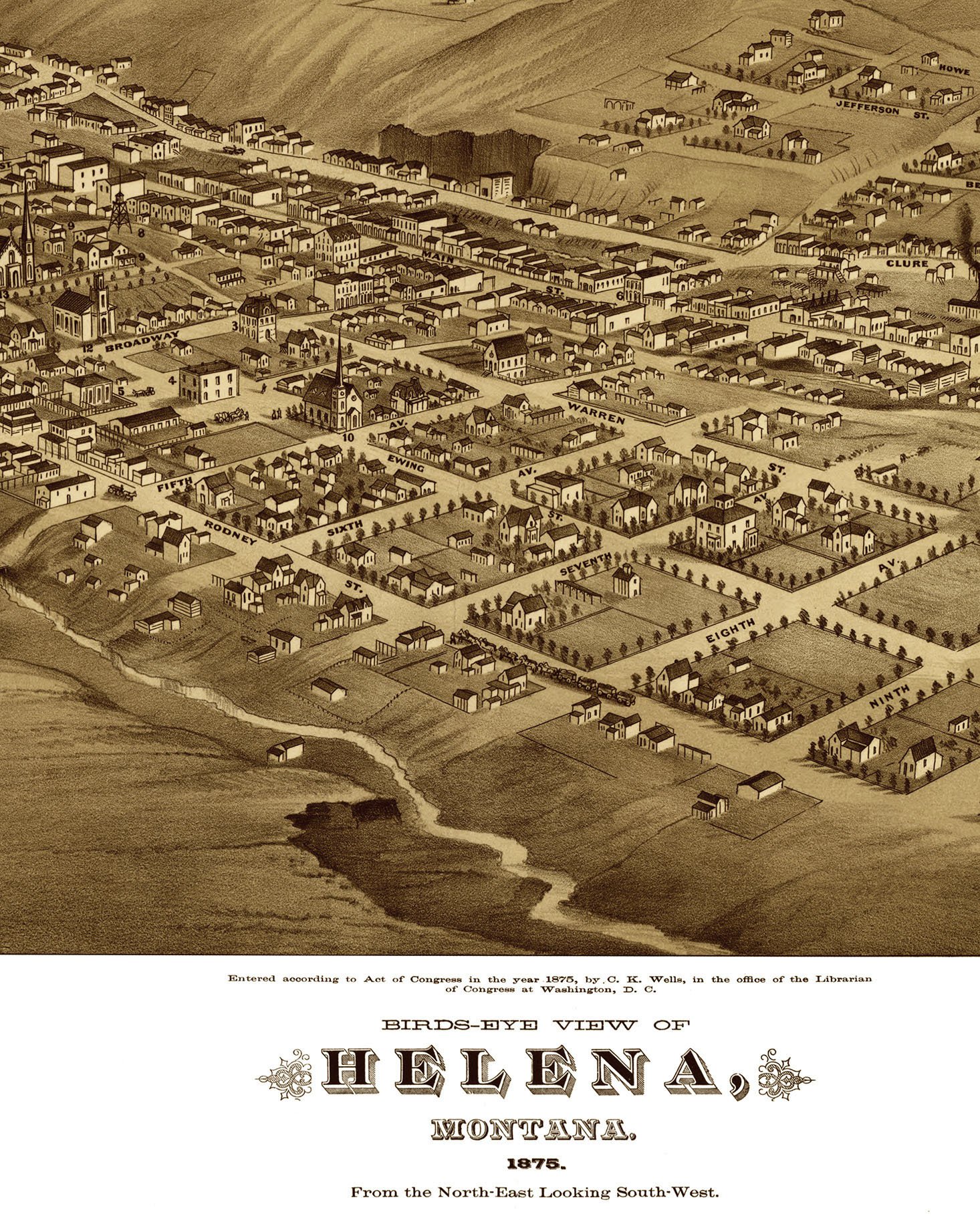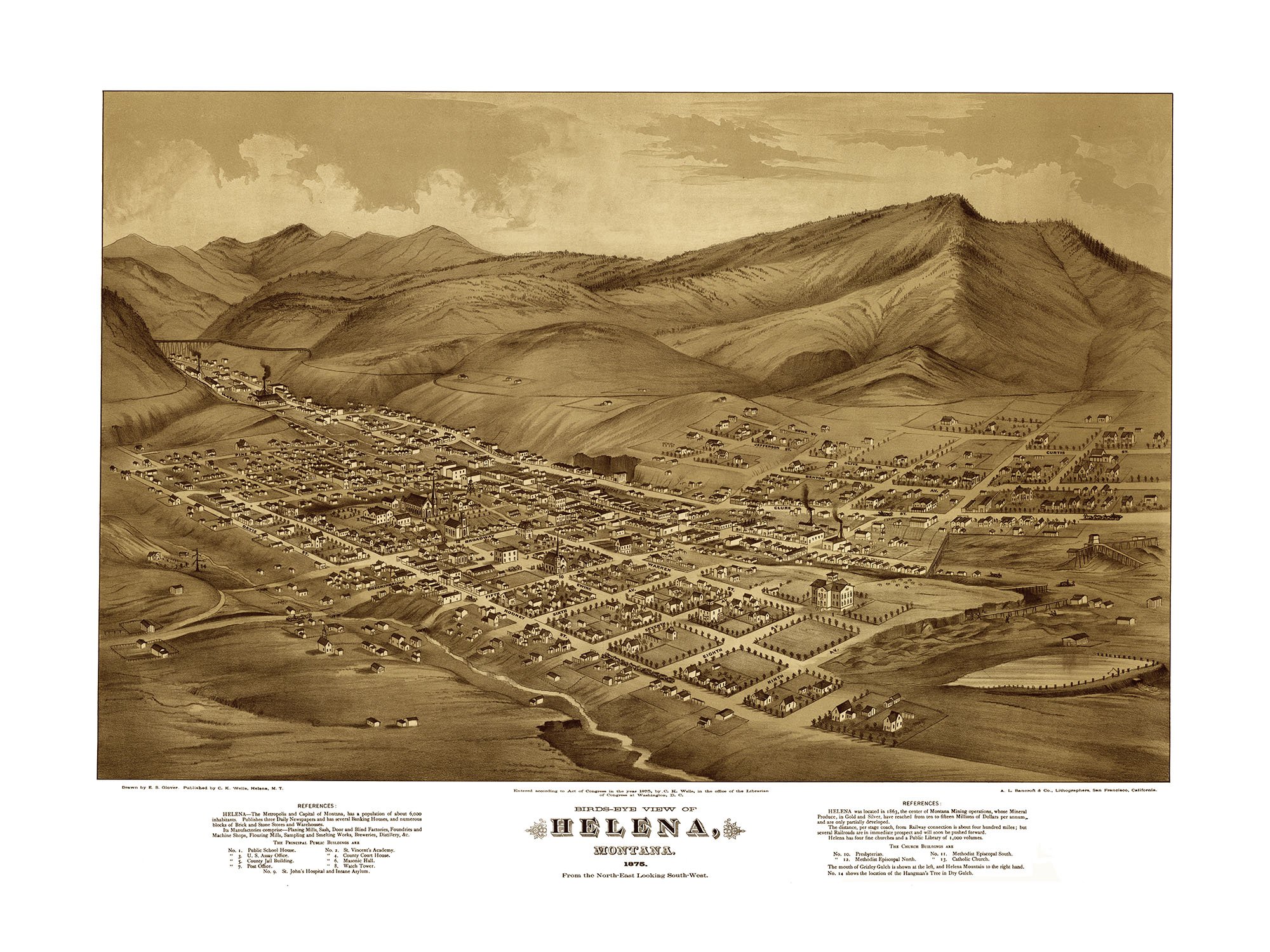 Helena, Montana in 1875 - Bird's Eye View Map, Aerial, Panorama, Vintage, Antique, Reproduction, Giclée, Framable, Fine Art, Wall Map