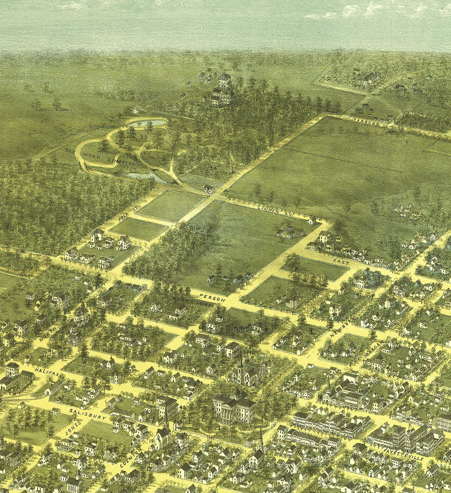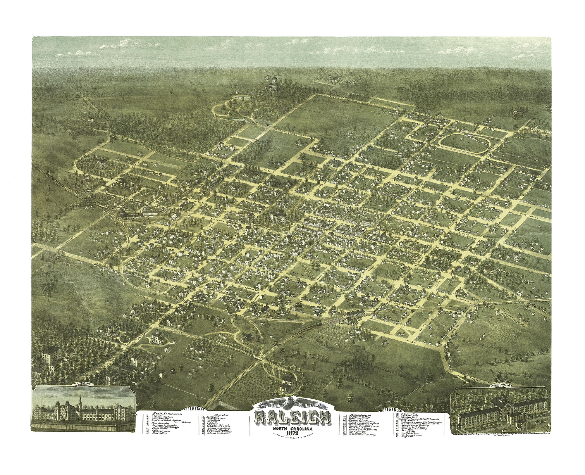 Raleigh, North Carolina in 1872 - Bird's Eye View, Aerial, Panorama, Vintage, Antique, Reproduction, Giclée, Framable, Fine Art, Wall art