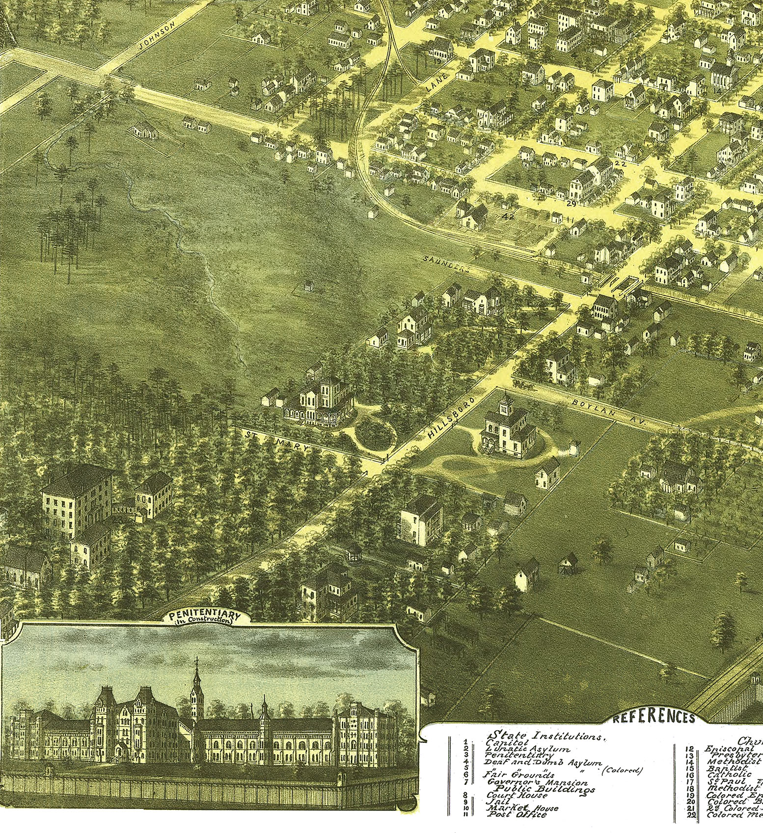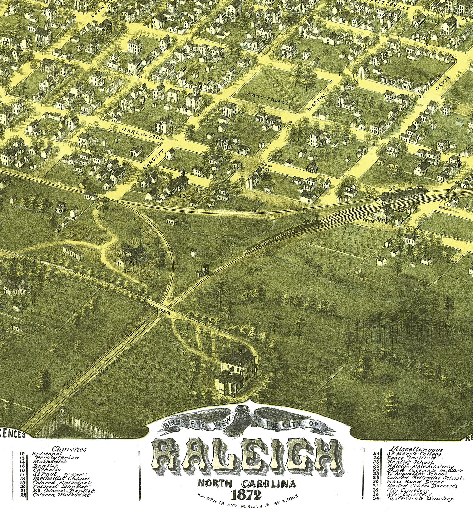 Full color fine art map of Raleigh, North Carolina in 1872. Extremely fine detail.