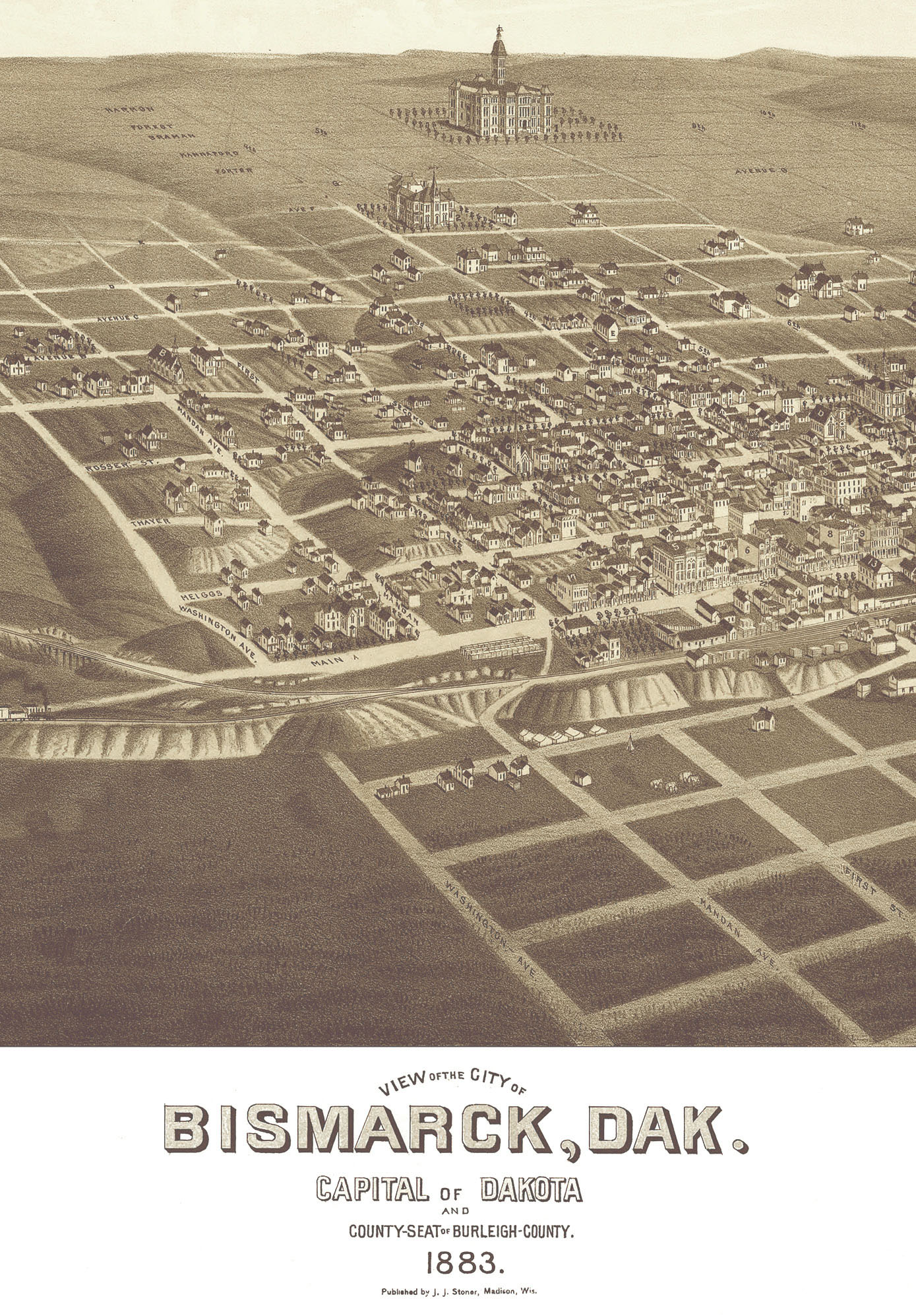 Bismarck, North Dakota in 1883 - Bird's Eye View Map, Aerial, Panorama, Vintage, Antique, Reproduction, Giclée, Framable, Fine Art, Wall Map