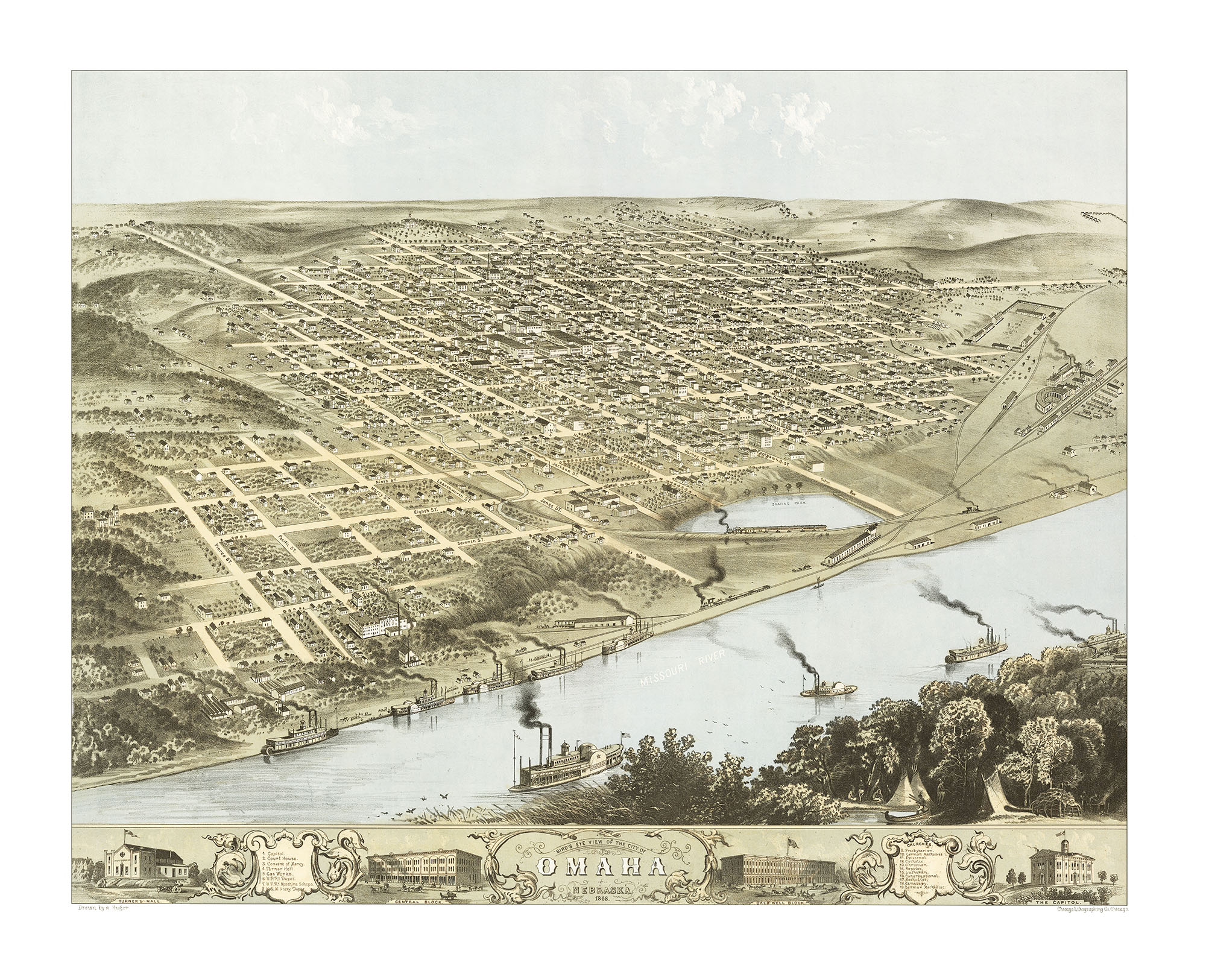 Omaha, Nebraska in 1868 - Bird's Eye View Map, Aerial, Panorama, Vintage map, Antique map, Giclée, Framable, Fine Art, Wall art