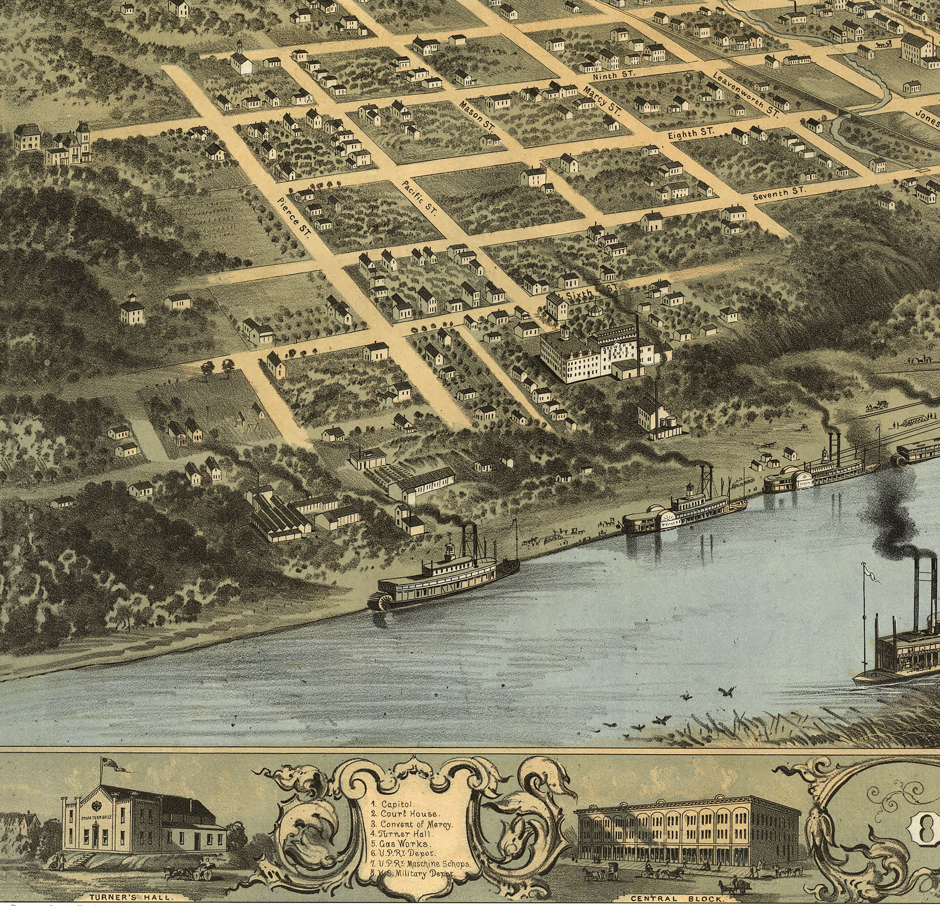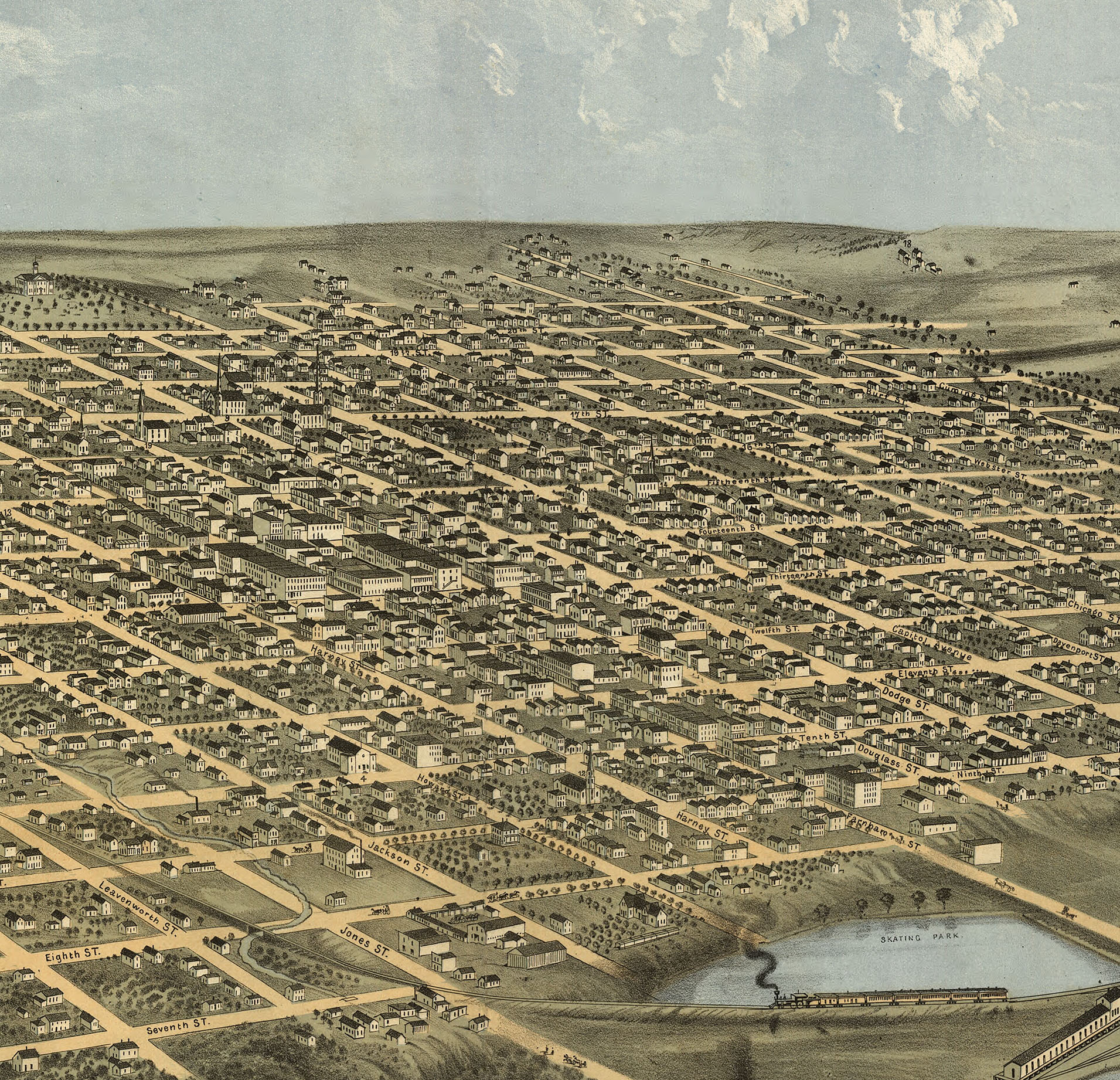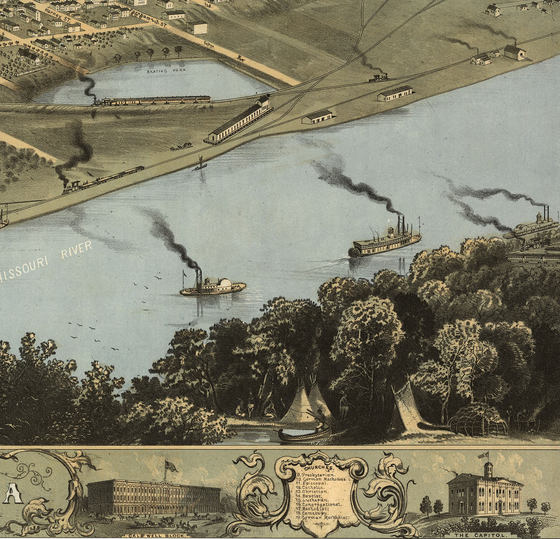 Full color "Bird's Eye View" fine art map of Omaha, Nebraska in 1868. Extremely fine detail.