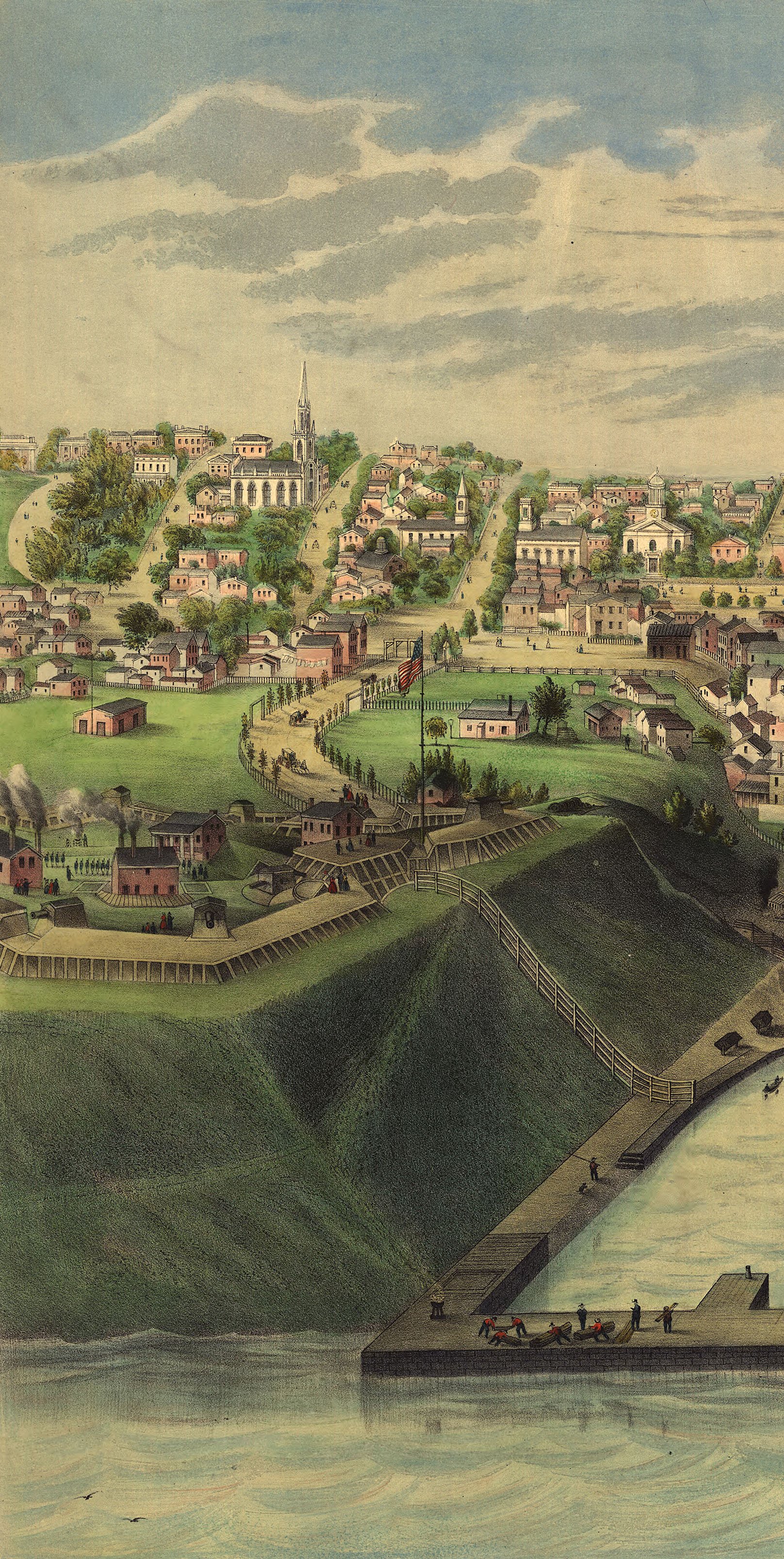 Full color "Bird's Eye View" fine art map of Oswego, New York in 1855. Extremely fine detail.