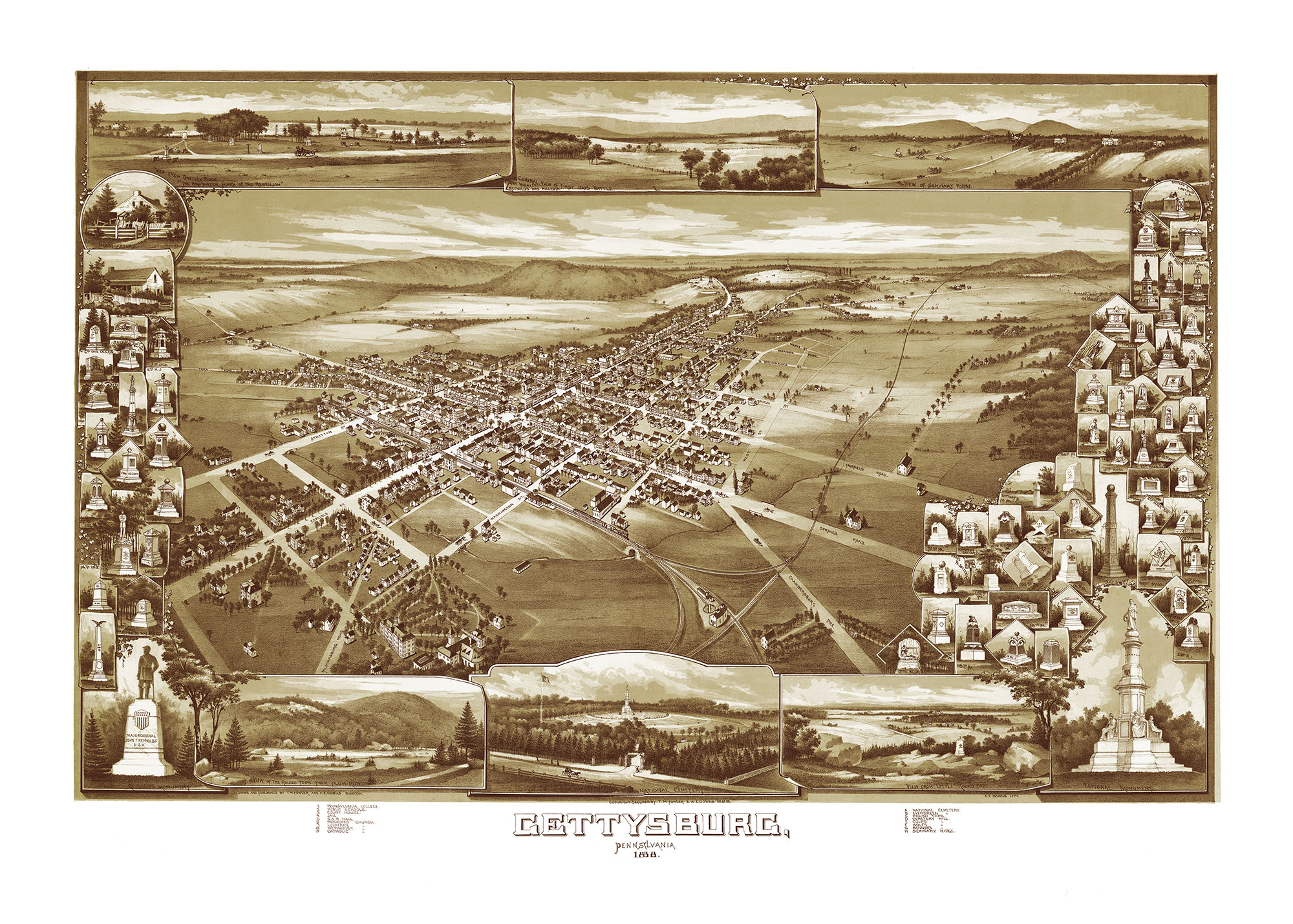 Sepia tone "Bird's Eye View" fine art map of Gettysburg, Pennsylvania in 1888. Extremely fine detail.