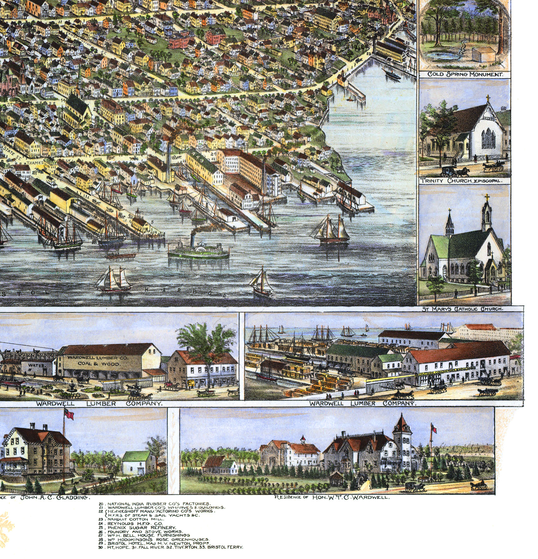 Bristol, Rhode Island in 1891 - Bird's Eye View, Map, Aerial, Panorama, Vintage, Antique, Fine Art, Wall art