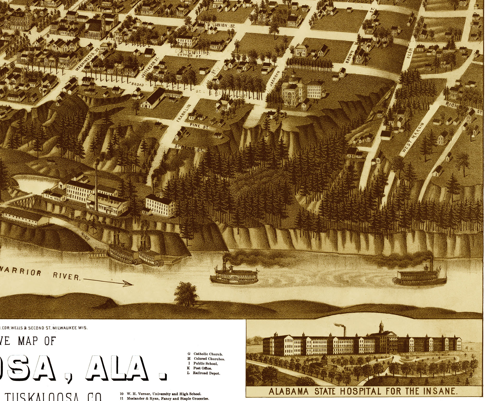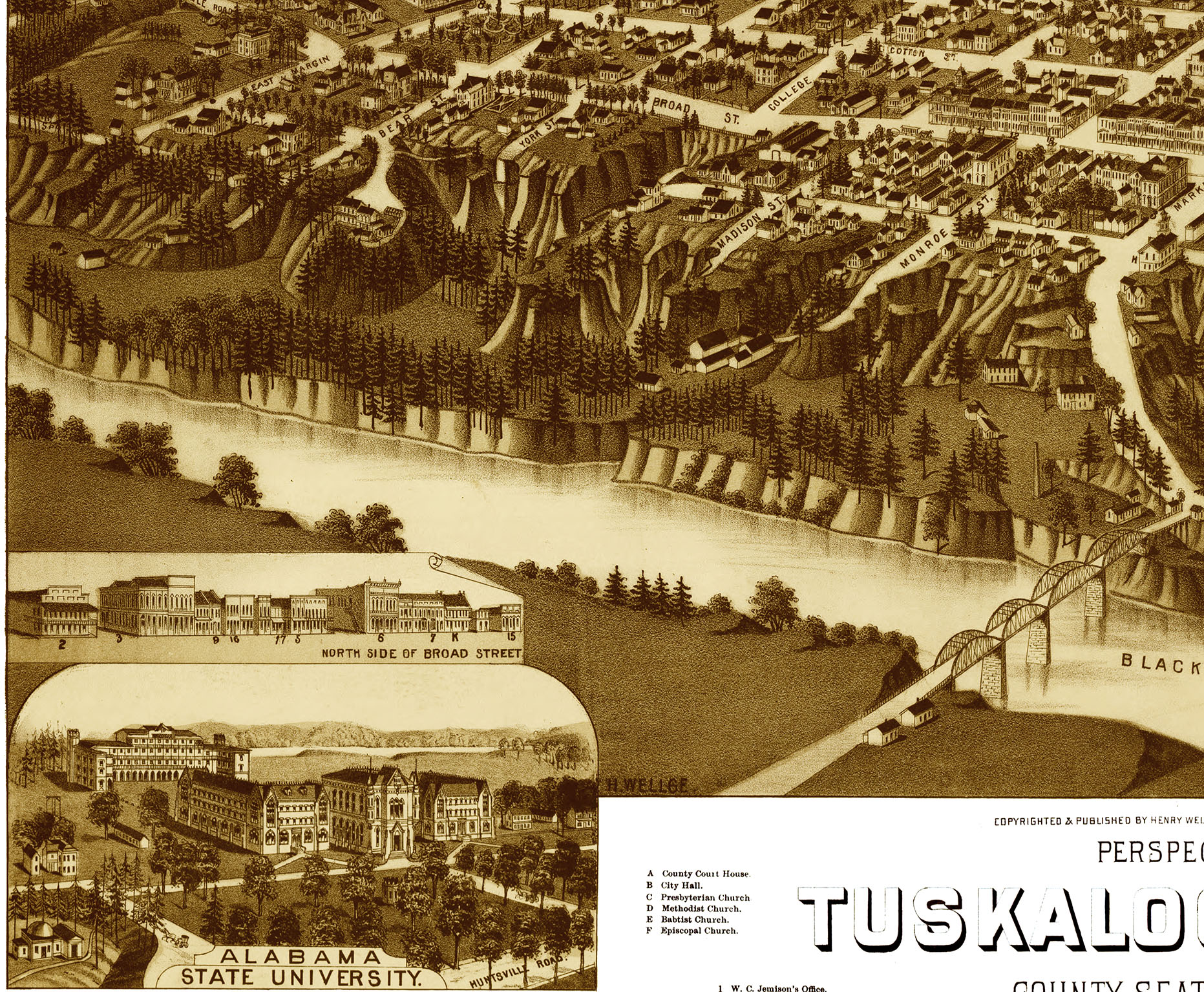 Tuscaloosa, Alabama in 1887 - Bird's Eye View Map, Aerial, Panorama, Vintage, Antique, Reproduction, Giclée, Fine Art, Wall Map, History