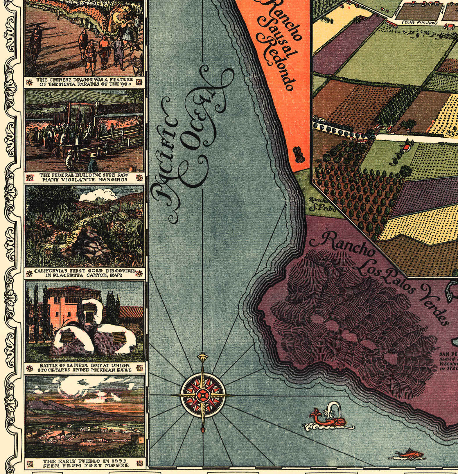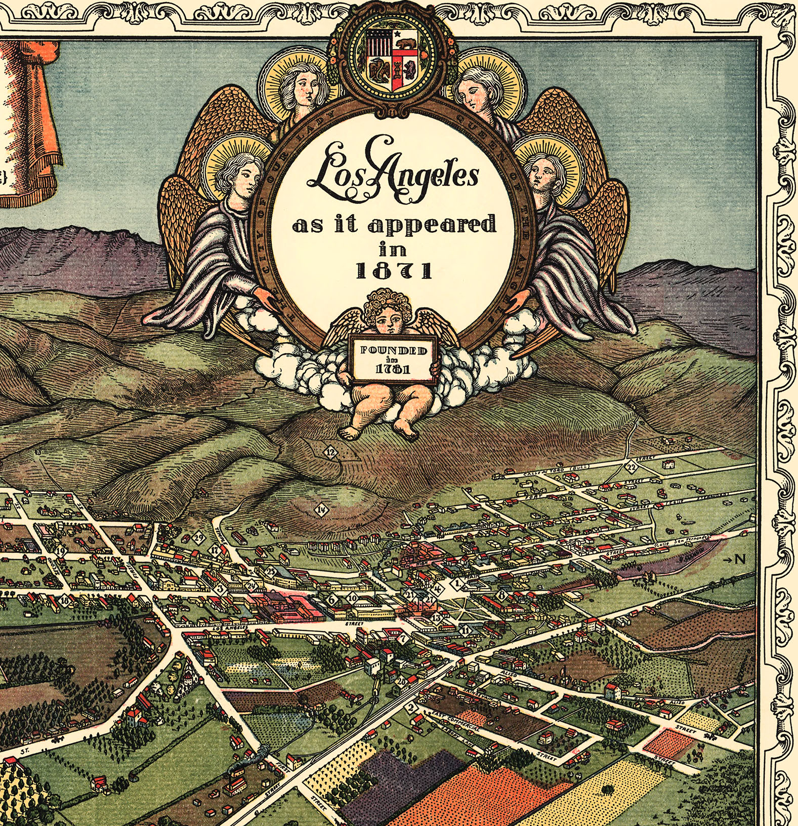 Brilliant, full color, fine art map of Los Angeles, California as it appeared in 1871, with special illustrations along the left border.
