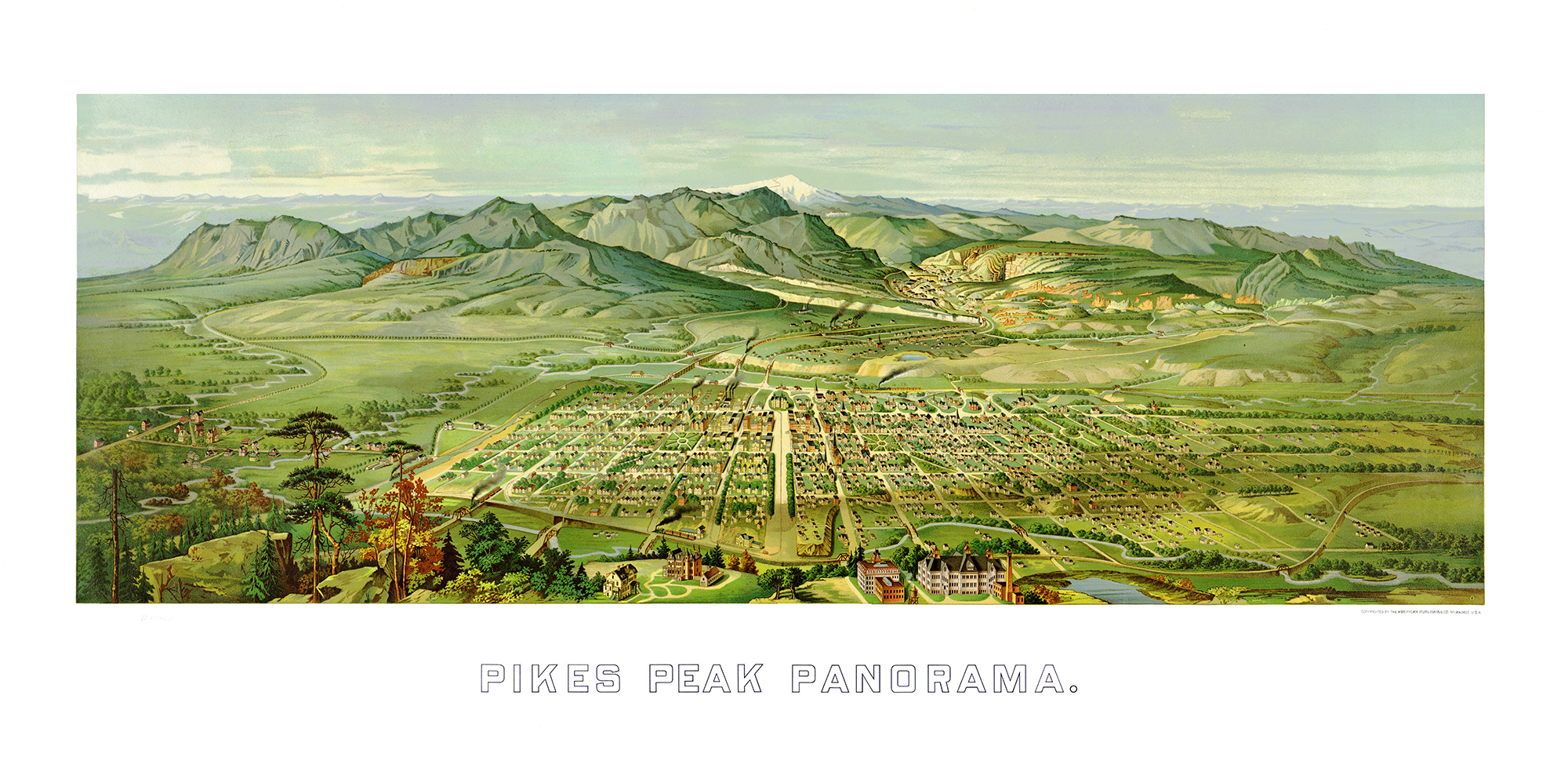 Brilliant color fine art map of Pike's Peak, Colorado Panorama from 1890. Vibrant colors, extremely fine detail.