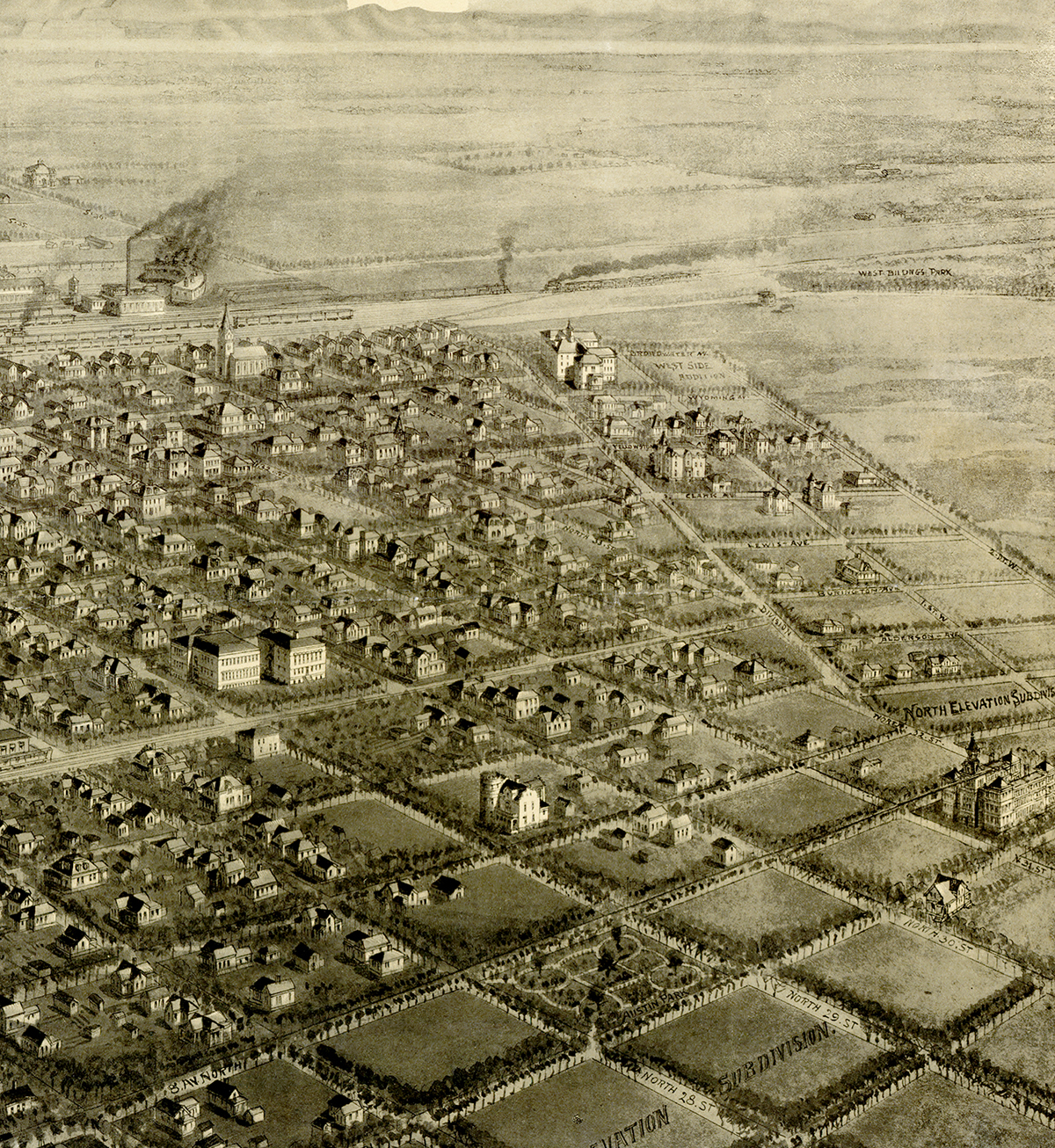 Sepia tone fine art reproduction of the Bird's Eye View of Billings Montana in 1904.