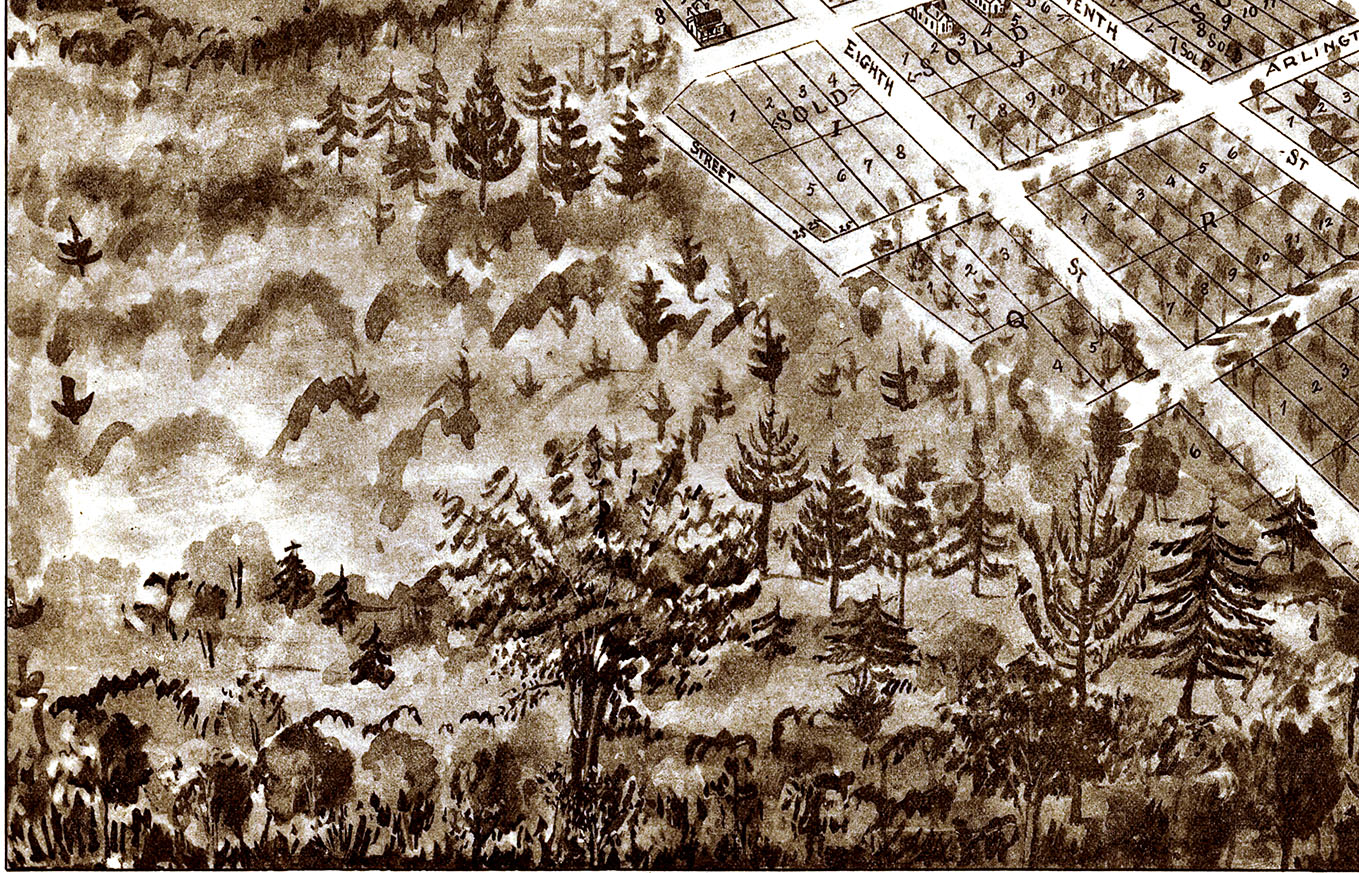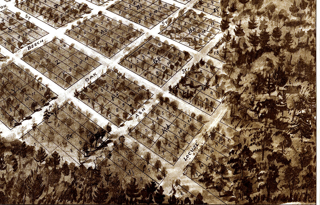 Perspective map is not to scale but gives a good relative representation of the buildings and streets in the early 20th century.