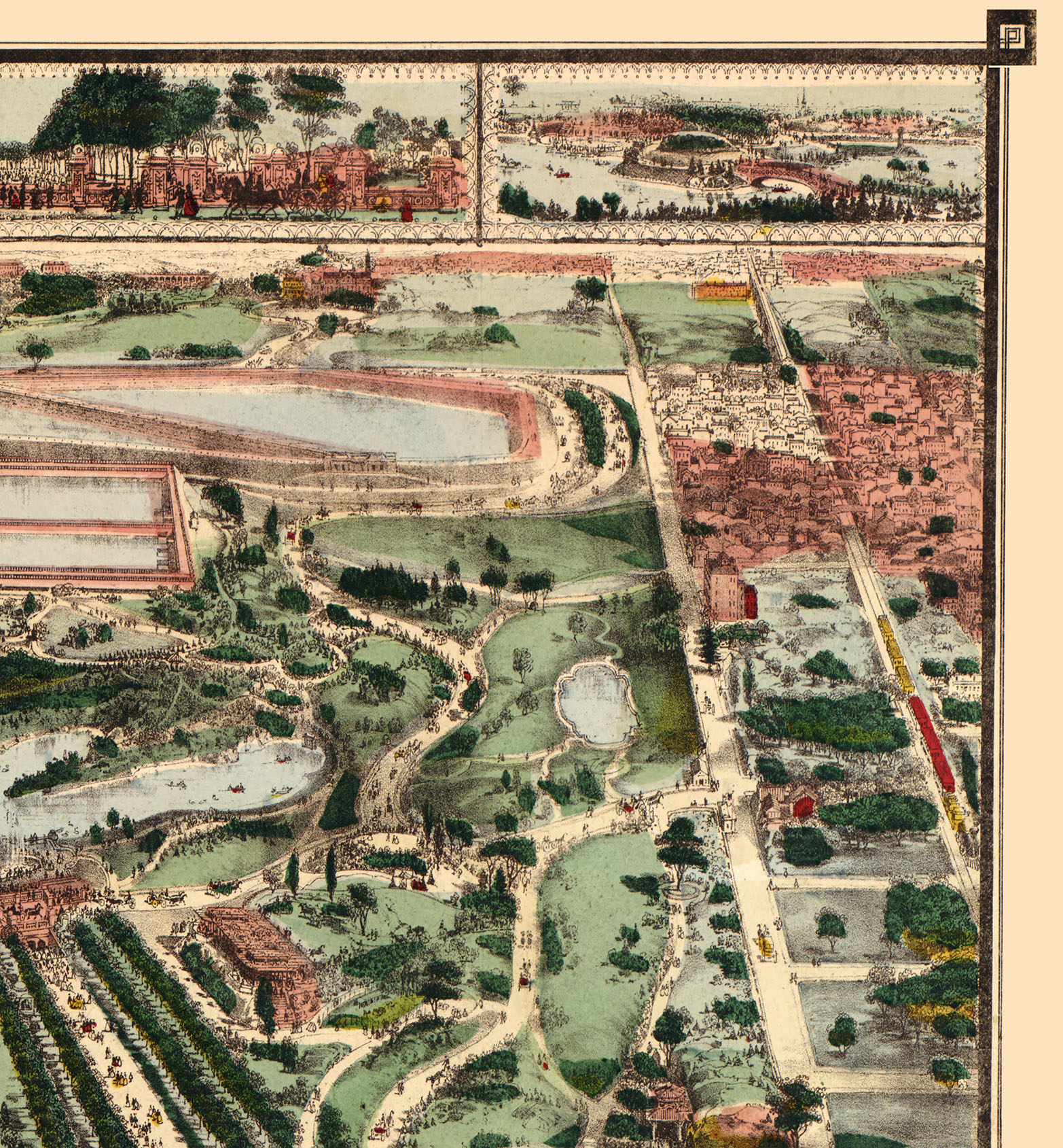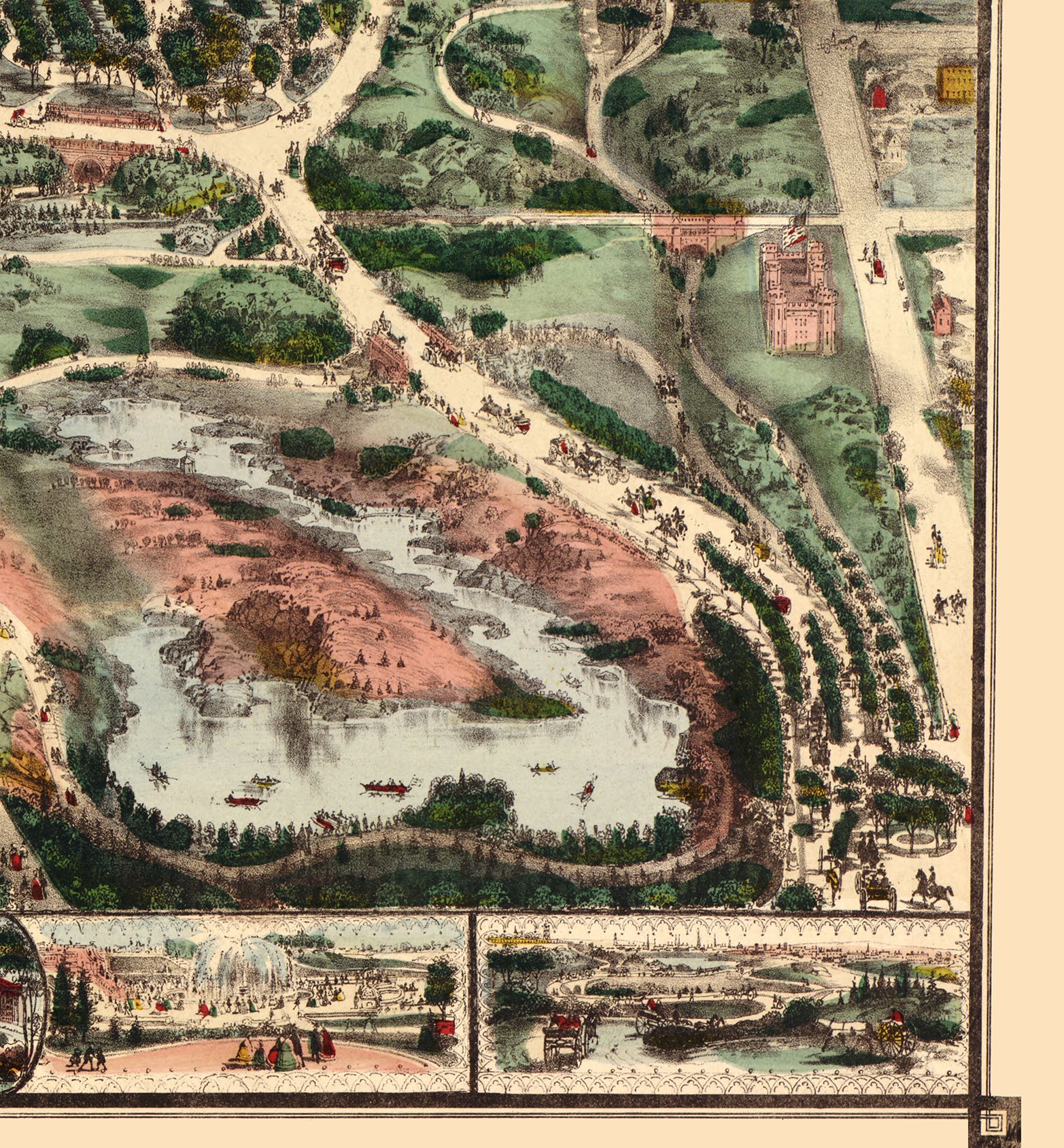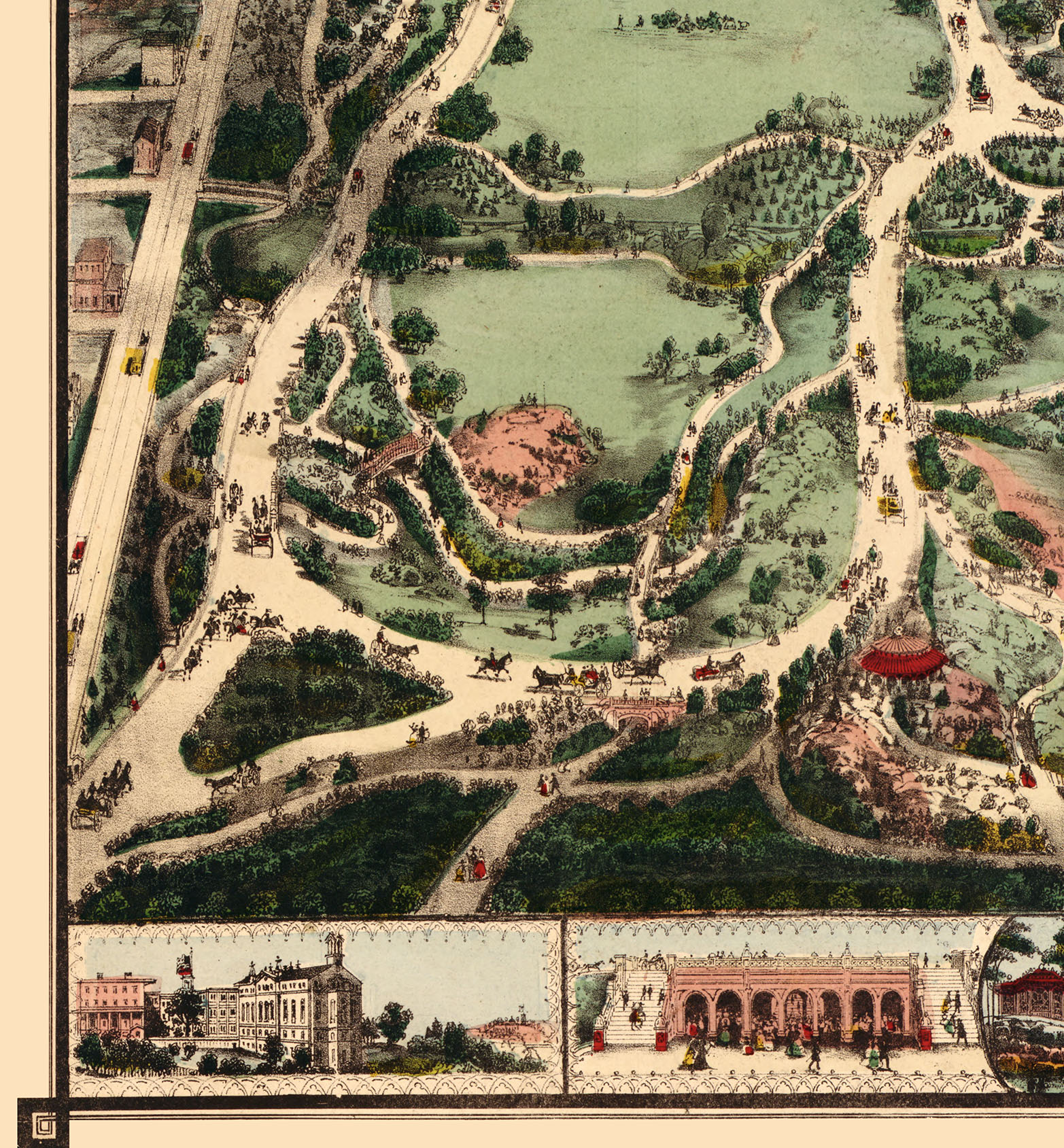 Perspective map is not to scale but gives a good relative representation of the layout of Central Park in the late 19th century. Fine detail is remarkable.