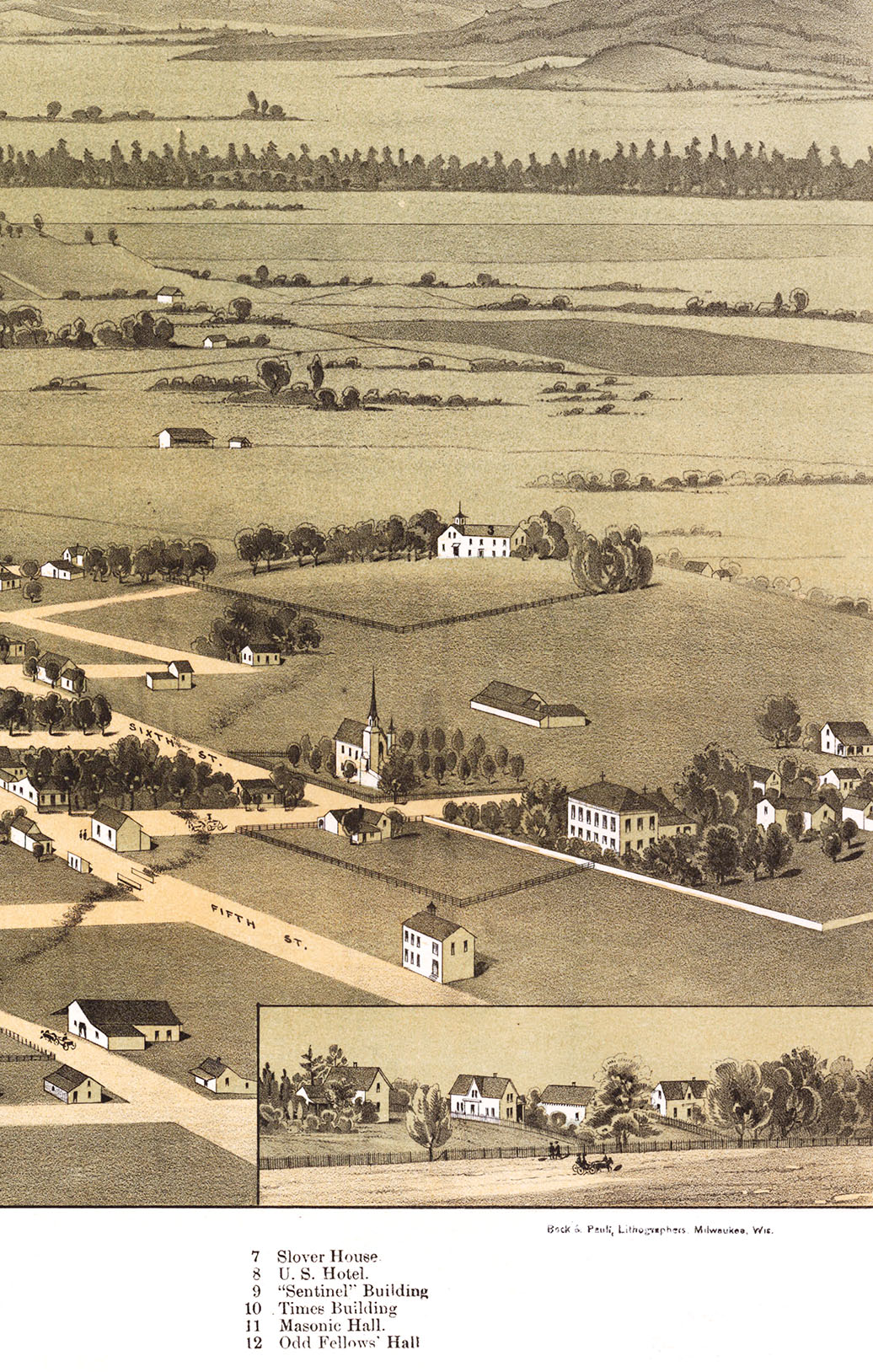 Perspective map is not to scale but gives a good relative representation of the buildings and the streets in the late 19th century. Fine detail is remarkable.