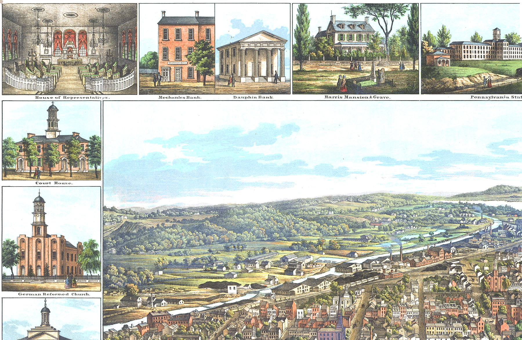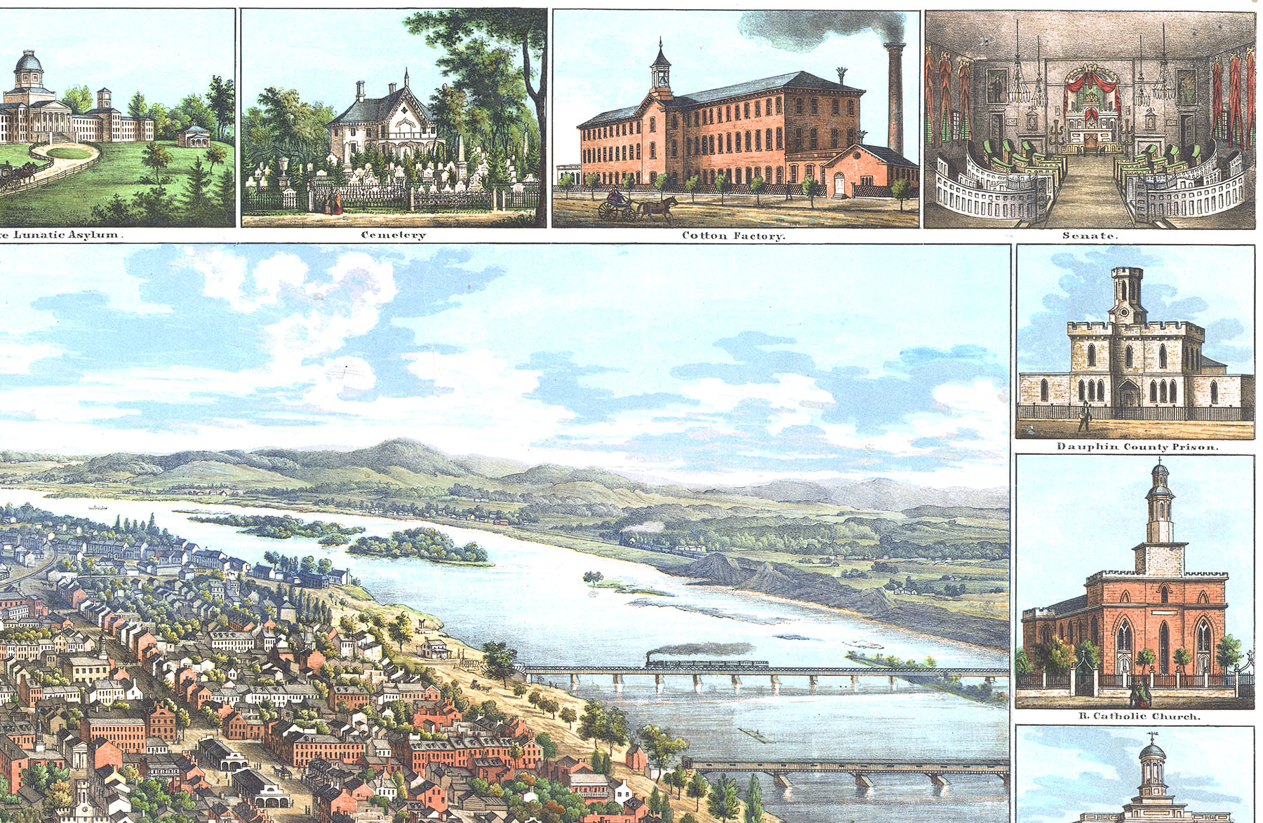 Harrisburg, Pennsylvania in 1855 - Bird's Eye View, Map, Aerial, Panorama, Vintage, Antique, Fine Art, Wall Art, History